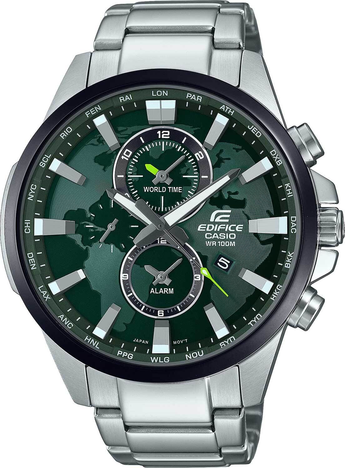 Мужские кварцевые часы с аналоговым отображением времени. Коллекция Edifice. Центральные часовая и минутная стрелки, секундная стрелка вынесена на дополнительный малый циферблат в позиции 9 часов. Зелёный циферблат с часовыми метками в виде штрихов. Изображение карты мира на циферблате. Стрелки и метки с люминесцентным покрытием, которое светится в темноте после непродолжительного воздействия света. Окошко даты в позиции 4 часов. Мировое время – 24 города (24 часовых пояса), всемирное координированное время (UTC). Будильник, ежечасный сигнал. Продолжительность звучания сигнала 20 секунд. Функция индикации заряда – в случае ослабевания заряда элемента питания секундная стрелка перемещается с интервалом в 2 секунды. Устойчивое к мелким механическим повреждениям минеральное стекло. Круглый стальной корпус размером 44,8 мм на 51,6 мм, толщиной 11,6 мм. Переводная головка с защитой. Стальной браслет с тройной раскладывающейся застежкой. Батарейка рассчитана на 3 года. Завинчивающаяся задняя крышка. Водонепроницаемость WR100 (часы подходят для плавания с маской и трубкой, обычного плавания). Вес около 160 г.