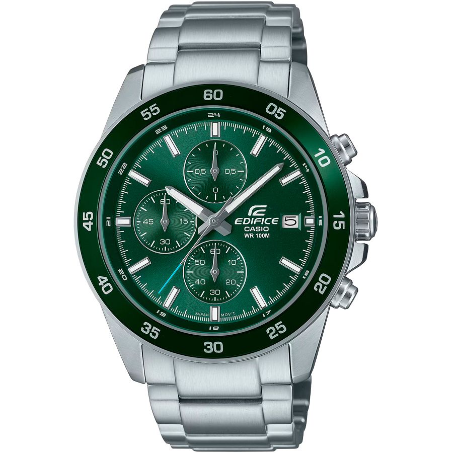 Мужские кварцевые аналоговые часы-хронограф с секундомером. Коллекция Edifice. Центральные часовая, минутная и секундная стрелки. Зелёный циферблат с часовыми метками в виде штрихов. Стрелки и метки с люминесцентным покрытием, которое светится в темноте после непродолжительного воздействия света. Окошко даты в позиции 3 ч. Секундомер с точностью показаний 1/10с и временем измерения 1ч. Режимы измерения: прошедшее время, промежуточное время, два финишных результата. Устойчивое к мелким механическим повреждениям минеральное стекло. Круглый корпус из нержавеющей стали. Размер корпуса 43,8 мм на 48,5 мм, толщина 11,6 мм. Переводная головка с защитой. Задняя крышка с винтовым фиксатором. Стальной браслет с раскладывающейся застежкой с фиксатором. Батарейка рассчитана на 2 года. Водонепроницаемость WR100 (плавание и погружение без акваланга). Вес примерно 149 г.