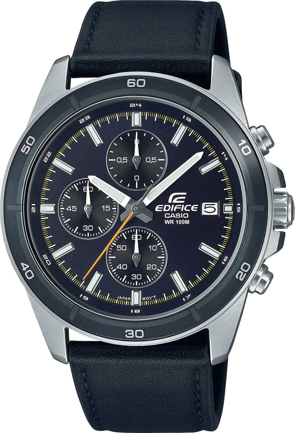 Мужские кварцевые аналоговые часы-хронограф с секундомером. Коллекция Edifice. Центральные часовая, минутная и секундная стрелки. Чёрный циферблат с часовыми метками в виде штрихов. Стрелки и метки с люминесцентным покрытием, которое светится в темноте после непродолжительного воздействия света. Окошко даты в позиции 3 ч. Секундомер с точностью показаний 1/10 с и временем измерения 1ч. Режимы измерения: прошедшее время, промежуточное время, два финишных результата. Устойчивое к мелким механическим повреждениям минеральное стекло. Круглый стальной корпус с IP покрытием чёрного цвета на безеле. Размер корпуса 43,8 мм на 48,5 мм, толщина 11,6 мм. Минутная шкала на безеле. Переводная головка с защитой. Задняя крышка с винтовым фиксатором. Чёрный кожаный ремешок с классической застёжкой buckle. Батарейка рассчитана на 2 года. Водонепроницаемость WR 100 (часы подходят для плавания с маской, трубкой и обычного плавания). Вес около 74 г.