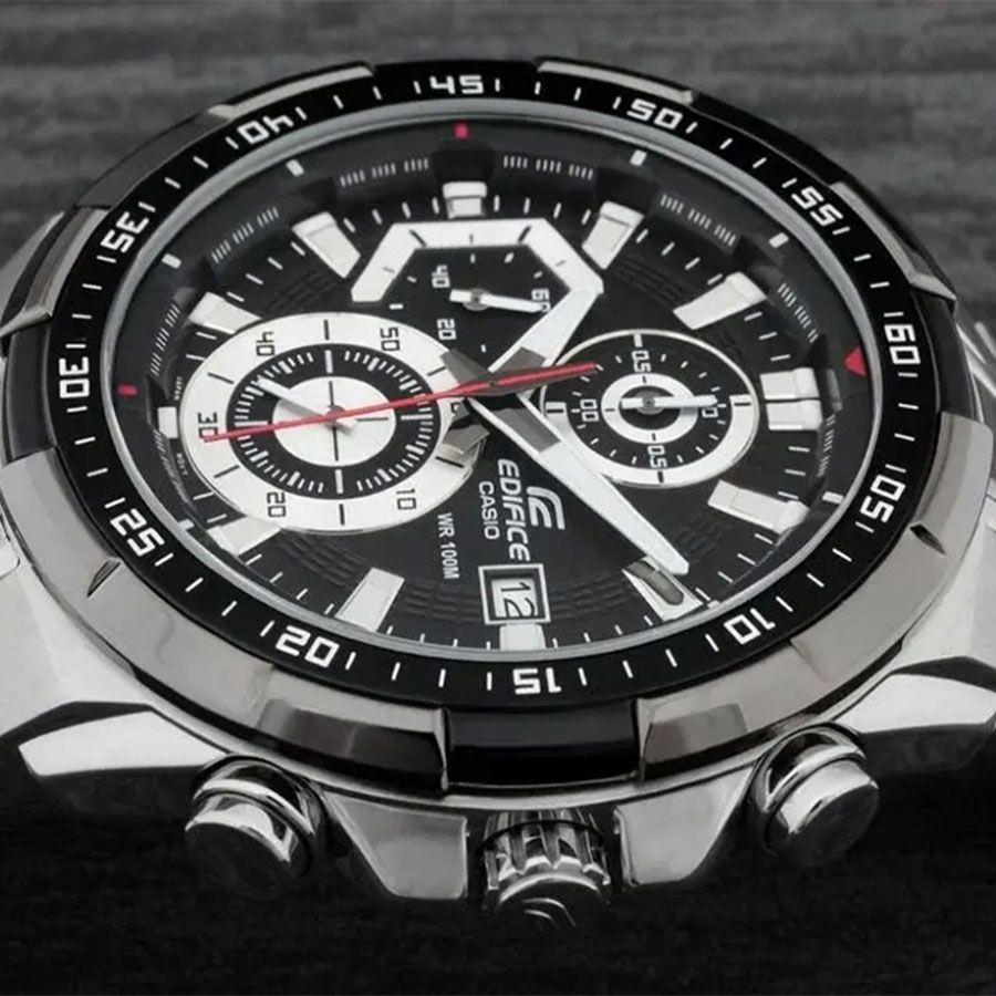 Мужские кварцевые аналоговые часы-хронограф с секундомером. Коллекция Edifice. Центральные часовая, минутная и секундная стрелки. Чёрный циферблат с часовыми метками в виде штрихов. Стрелки и метки с люминесцентным покрытием, которое светится в темноте после непродолжительного воздействия света. Окошко даты в позиции 3 ч. Минутная шкала на циферблате. Секундомер с точностью показаний 1/10 с и временем измерения 1 ч. Режимы измерения: прошедшее время, промежуточное время, два финишных результата. Устойчивое к мелким механическим повреждениям минеральное стекло. Круглый корпус из нержавеющей стали с IP покрытием чёрного цвета на безеле. Размер корпуса 49,5 мм на 54,1 мм, толщина 11,7 мм. Переводная головка с защитой. Задняя крышка с винтовым фиксатором. Стальной браслет с тройной раскладывающейся застежкой. Батарейка рассчитана на 2 года. Водонепроницаемость WR100 (часы подходят для плавания с маской, трубкой и обычного плавания). Вес примерно 185 г.