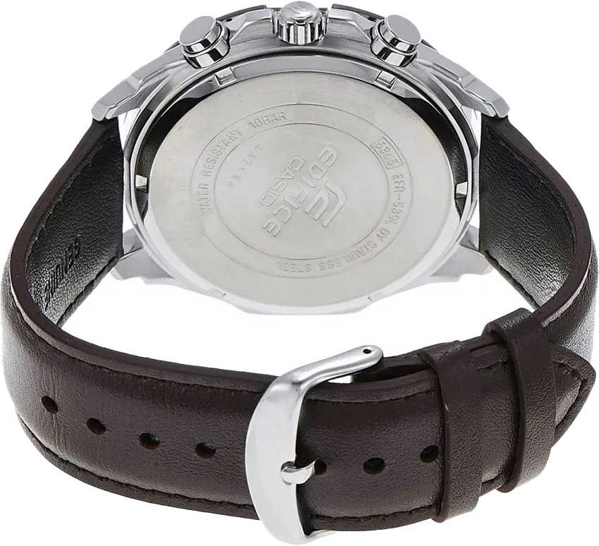 Мужские кварцевые аналоговые часы-хронограф с секундомером. Коллекция Edifice. Центральные часовая, минутная и секундная стрелки. Коричневый циферблат с часовыми метками в виде штрихов. Стрелки и метки с люминесцентным покрытием, которое светится в темноте после непродолжительного воздействия света. Окошко даты в позиции 3 ч. Секундомер с точностью показаний 1/10с и временем измерения 1ч. Режимы измерения: прошедшее время, промежуточное время, два финишных результата. Устойчивое к мелким механическим повреждениям минеральное стекло. Круглый корпус из нержавеющей стали. Размер корпуса 49,5 мм на 54,1 мм, толщина 11,7 мм. Переводная головка с защитой. Задняя крышка с винтовым фиксатором.. Коричневый кожаный ремешок с классической застёжкой buckle. Батарейка рассчитана на 2 года. Водонепроницаемость WR100 (плавание и погружение без акваланга). Вес примерно 97 г.