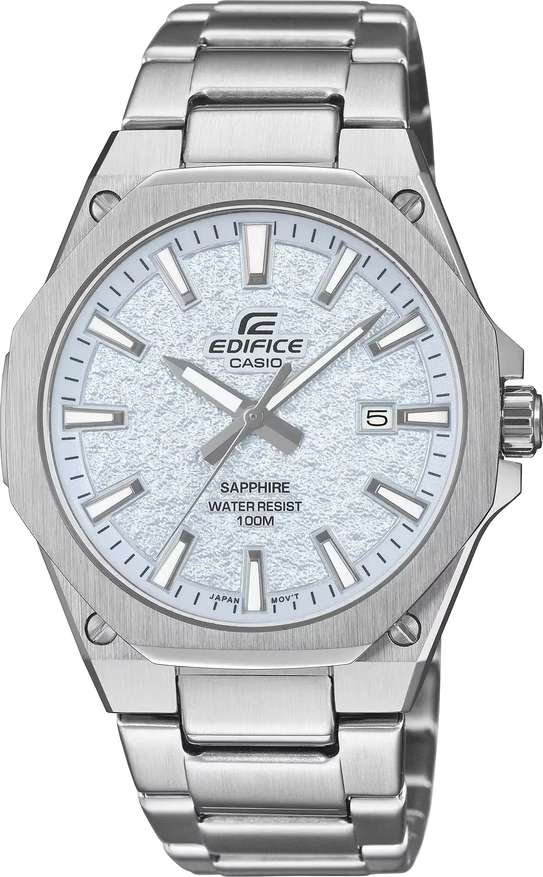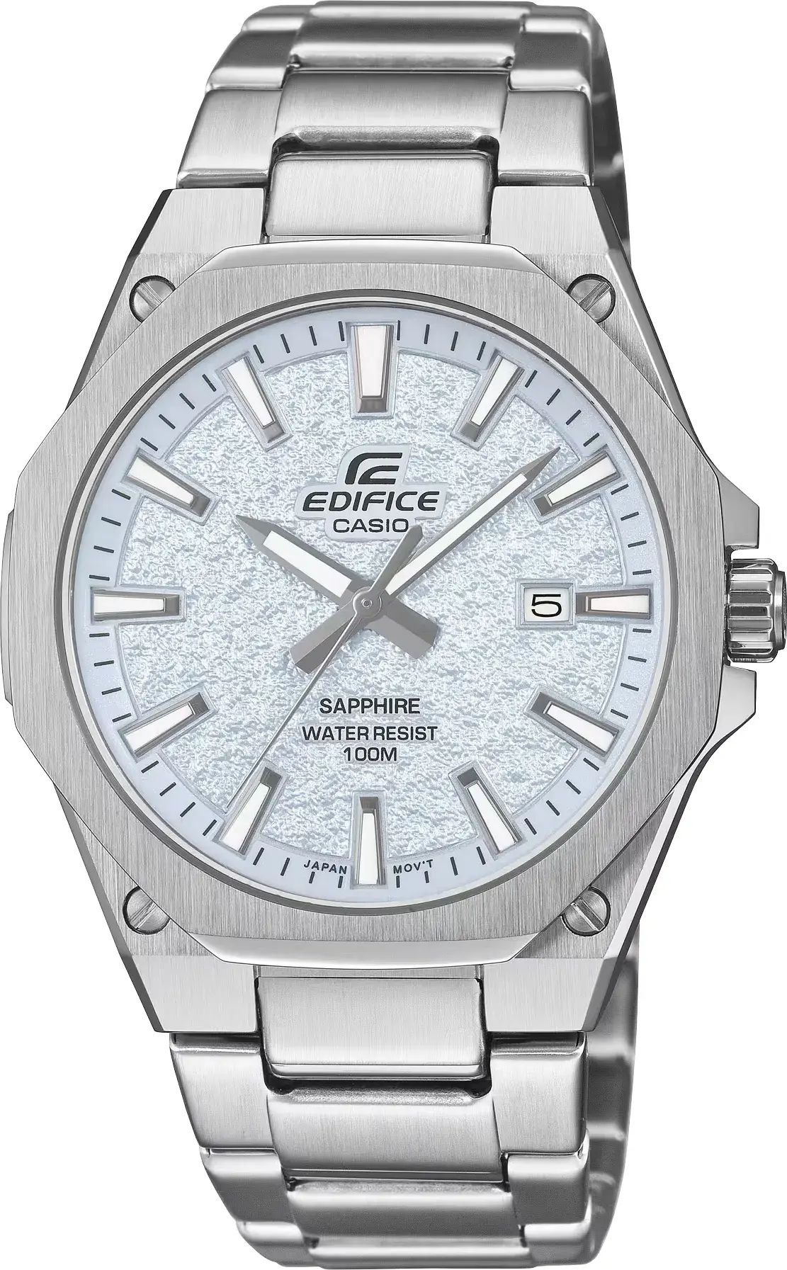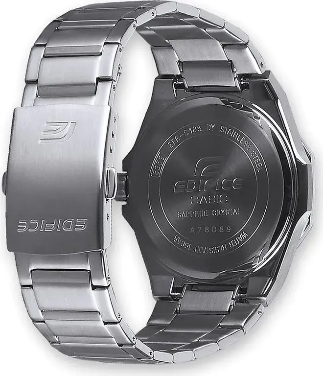 Мужские кварцевые часы с аналоговым отображением времени. Коллекция Edifice. Центральные часовая, минутная и секундная стрелки. Голубой циферблат с часовыми метками в виде штрихов. Стрелки и метки с люминесцентным покрытием, которое светится в темноте после непродолжительного воздействия света. Окошко даты в позиции 3 часов. Устойчивое к возникновению мелких царапин сапфировое стекло с антибликовым покрытием. Восьмиугольный стальной корпус размером 44,8 мм на 39,9 мм, толщиной 7,8 мм. Переводная головка с защитой. Стальной браслет с тройной раскладывающейся застежкой. Батарейка рассчитана на 3 года. Водонепроницаемость WR100 (часы подходят для плавания с маской и трубкой, обычного плавания). Вес около 110 г.