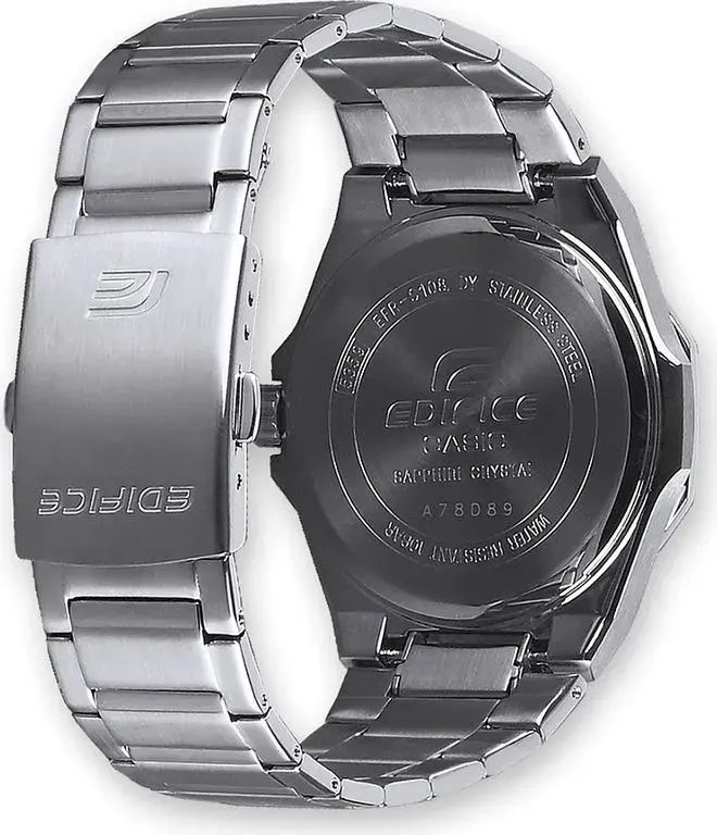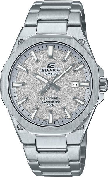 Мужские кварцевые часы с аналоговым отображением времени. Коллекция Edifice. Центральные часовая, минутная и секундная стрелки. Серый циферблат с часовыми метками в виде штрихов. Стрелки и метки с люминесцентным покрытием, которое светится в темноте после непродолжительного воздействия света. Окошко даты в позиции 3 часов. Устойчивое к возникновению мелких царапин сапфировое стекло с антибликовым покрытием. Восьмиугольный стальной корпус размером 44,8 мм на 39,9 мм, толщиной 7,8 мм. Переводная головка с защитой. Стальной браслет с тройной раскладывающейся застежкой. Батарейка рассчитана на 3 года. Водонепроницаемость WR100 (часы подходят для плавания с маской и трубкой, обычного плавания). Вес около 110 г.