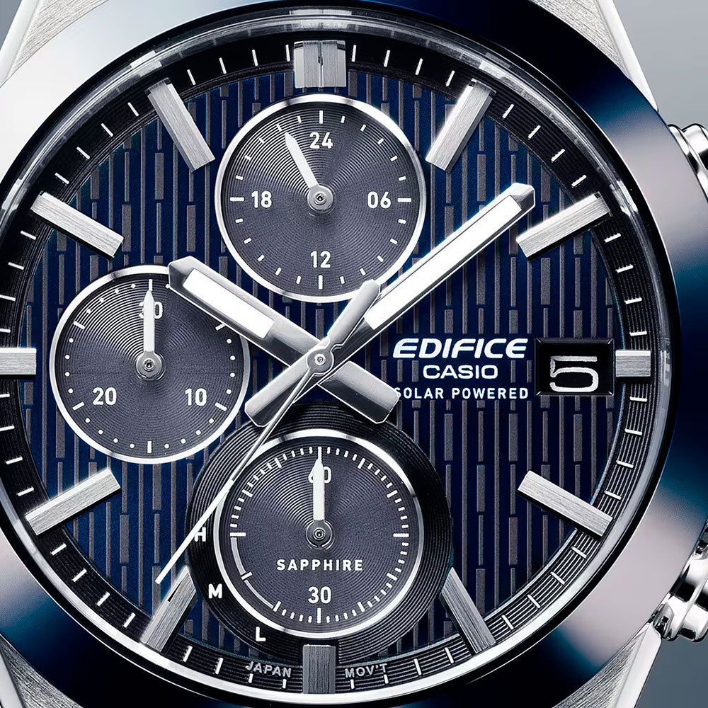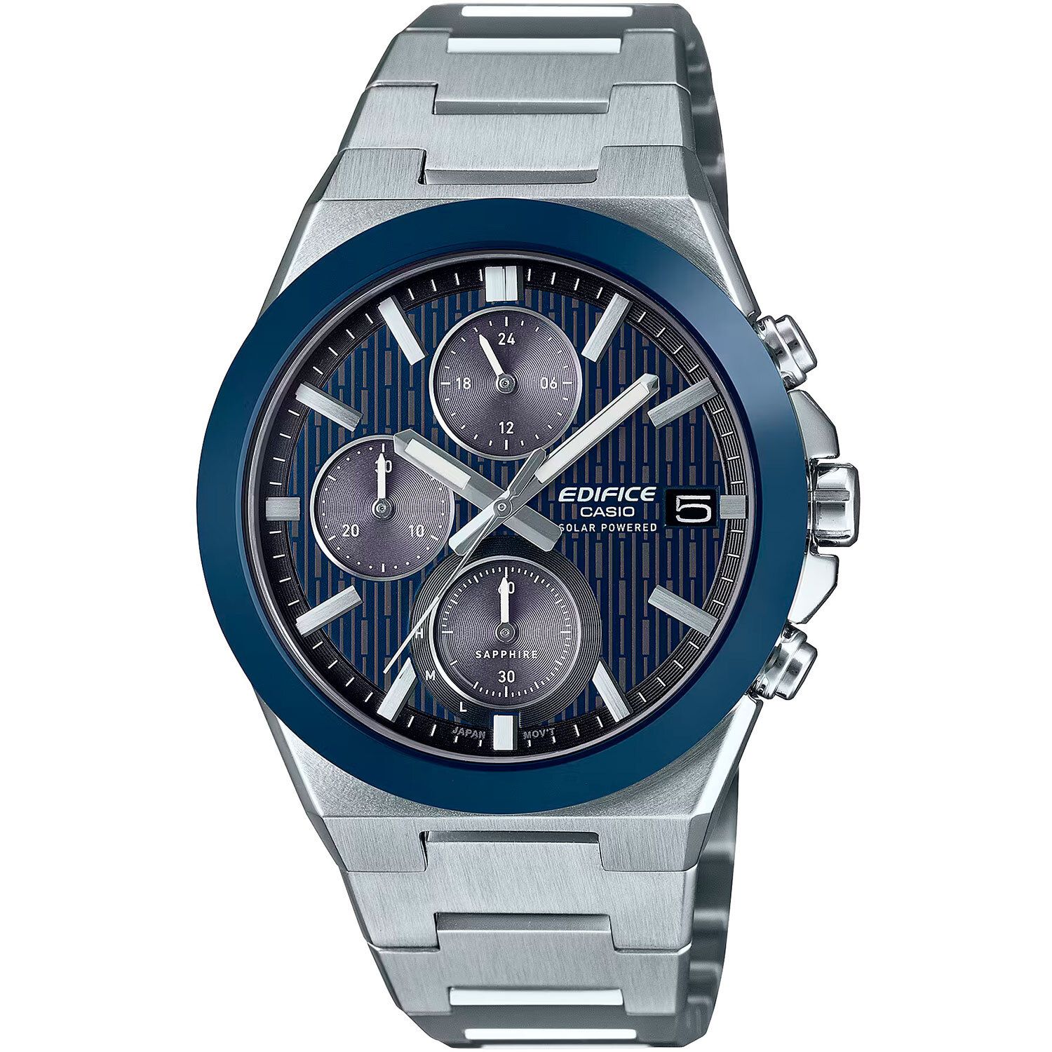 Мужские кварцевые аналоговые наручные часы-хронограф с секундомером. Серия Edifice. Питание от солнечной энергии (технология Tough Solar) - источником питания служит светочувствительная панель и аккумулятор, заряжаемый при попадании солнечного света на циферблат часов. Индикатор уровня зарядки батареи. Время работы аккумулятора без подзарядки около 5 месяцев. Синий циферблат с часовыми метками в виде штрихов. Центральные часовая, минутная и секундная стрелки. Стрелки и метки с люминесцентным покрытием, которое светится в темноте после непродолжительного воздействия света. Окошко даты в положении 3 часов. Секундомером с точностью показаний 1 с и временем измерения 30 минут. Режимы измерения: прошедшее время, промежуточное время, два финишных результата. Стрелочный указатель времени суток - 24-часовая шкала в положении 12 часов. Круглый стальной корпус с синим керамическим безелем. Керамический безель отличается особенной твердостью и прочностью и более устойчив к царапинам, в сравнении со сталью. Размер корпуса 46,7 мм на 40,9 мм, толщина 11,7 мм. Устойчивое к возникновению мелких царапин сапфировое стекло с антибликовым покрытием. Переводная головка с защитой. Стальной браслет с раскладывающейся застежкой. Завинчивающаяся задняя крышка. Водонепроницаемость 100WR (часы подходят для плавания с маской и трубкой, обычного плавания). Вес около 140 г.