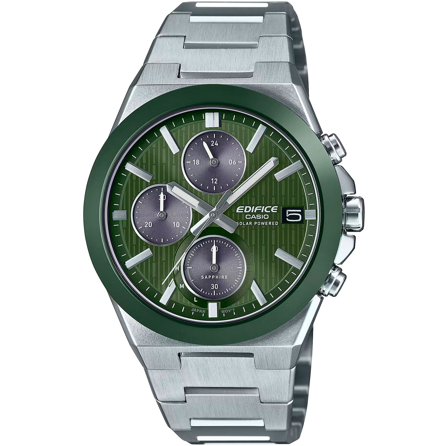 Мужские кварцевые аналоговые наручные часы-хронограф с секундомером. Серия Edifice. Питание от солнечной энергии (технология Tough Solar) - источником питания служит светочувствительная панель и аккумулятор, заряжаемый при попадании солнечного света на циферблат часов. Индикатор уровня зарядки батареи. Время работы аккумулятора без подзарядки около 5 месяцев. Зелёный циферблат с часовыми метками в виде штрихов. Центральные часовая, минутная и секундная стрелки. Стрелки и метки с люминесцентным покрытием, которое светится в темноте после непродолжительного воздействия света. Окошко даты в положении 3 часов. Секундомером с точностью показаний 1 с и временем измерения 30 минут. Режимы измерения: прошедшее время, промежуточное время, два финишных результата. Стрелочный указатель времени суток - 24-часовая шкала в положении 12 часов. Круглый стальной корпус с зелёным керамическим безелем. Керамический безель отличается особенной твердостью и прочностью и более устойчив к царапинам, в сравнении со сталью. Размер корпуса 46,7 мм на 40,9 мм, толщина 11,7 мм. Устойчивое к возникновению мелких царапин сапфировое стекло с антибликовым покрытием. Переводная головка с защитой. Стальной браслет с раскладывающейся застежкой. Завинчивающаяся задняя крышка. Водонепроницаемость 100WR (часы подходят для плавания с маской и трубкой, обычного плавания). Вес около 140 г.