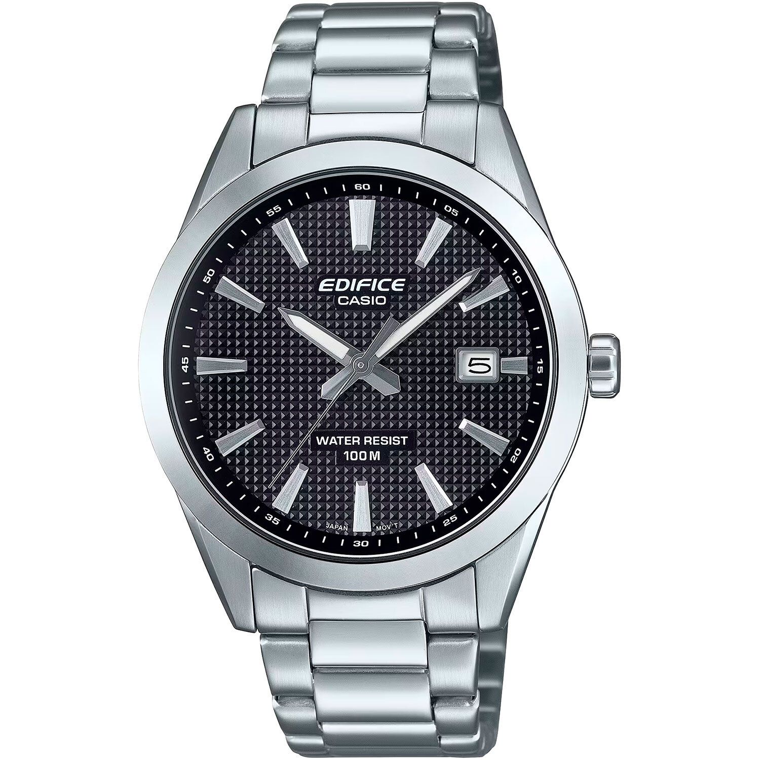 Мужские кварцевые часы с аналоговым отображением времени. Коллекция Edifice. Центральные часовая, минутная и секундная стрелки. Чёрный текстурный циферблат с метками в виде штрихов украшен узором «Clous de Paris». Стрелки и часовые метки метки с люминесцентным покрытием, которое светится в темноте после непродолжительного воздействия света. Окошко даты в позиции 3 часов. Минутная шкала по внешнему краю циферблата. Устойчивое к мелким механическим повреждениям минеральное стекло. Круглый стальной корпус размером 40 мм на 47,5 мм, толщиной 10 мм. Стальной браслет с тройной раскладывающейся застежкой. Батарейка рассчитана на 3 года. Завинчивающаяся задняя крышка. Водонепроницаемость WR100 ( (часы подходят для плавания с маской и трубкой, обычного плавания). Вес около 110 г.