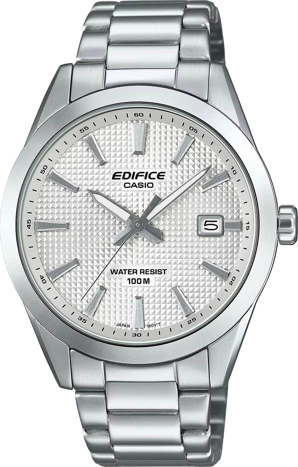 Мужские кварцевые часы с аналоговым отображением времени. Коллекция Edifice. Центральные часовая, минутная и секундная стрелки. Белый текстурный циферблат с метками в виде штрихов украшен узором «Clous de Paris». Стрелки и часовые метки метки с люминесцентным покрытием, которое светится в темноте после непродолжительного воздействия света. Окошко даты в позиции 3 часов. Минутная шкала по внешнему краю циферблата. Устойчивое к мелким механическим повреждениям минеральное стекло. Круглый стальной корпус размером 40 мм на 47,5 мм, толщиной 10 мм. Стальной браслет с тройной раскладывающейся застежкой. Батарейка рассчитана на 3 года. Завинчивающаяся задняя крышка. Водонепроницаемость WR100 ( (часы подходят для плавания с маской и трубкой, обычного плавания). Вес около 110 г.