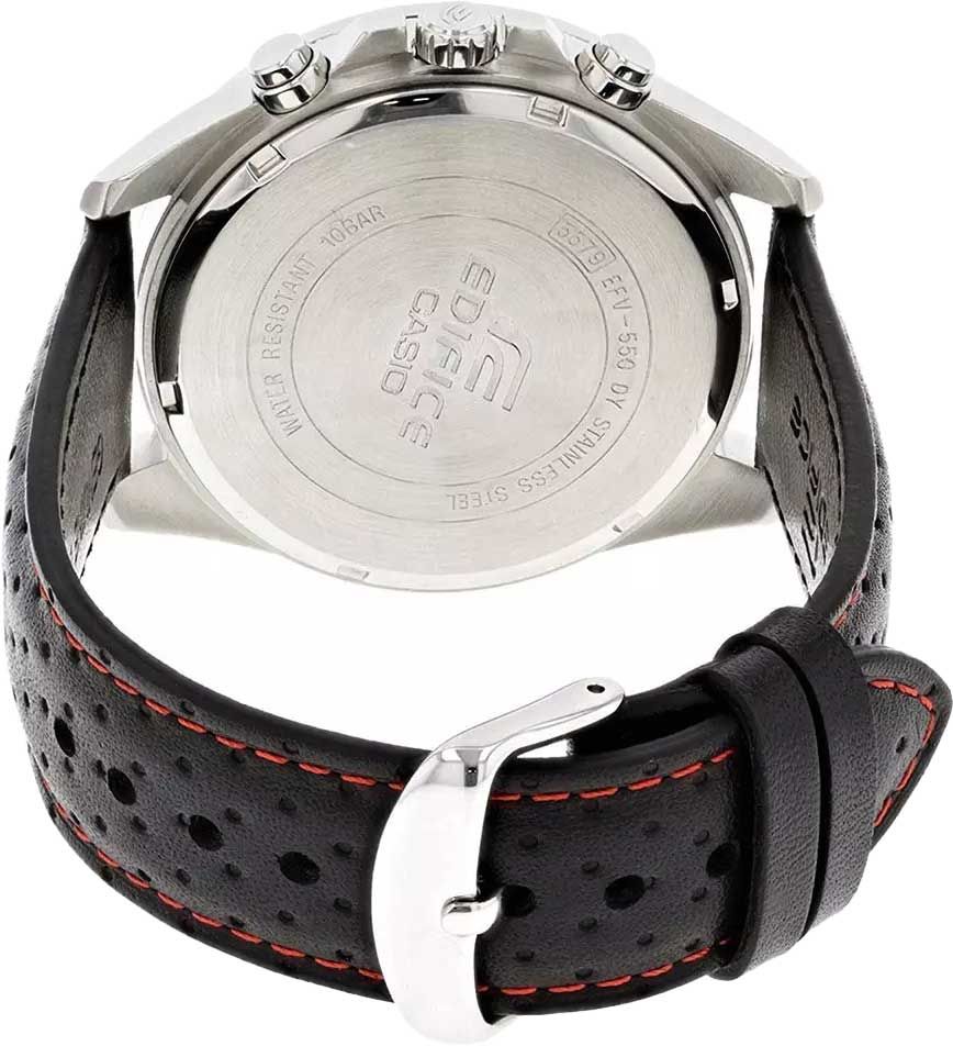 Мужские кварцевые аналоговые часы-хронограф с секундомером. Коллекция Edifice Chronograph. Центральные часовая, минутная и секундная стрелки. Чёрный циферблат с часовыми метками в виде штрихов. Стрелки и метки с люминесцентным покрытием, которое светится в темноте после непродолжительного воздействия света. Окошко даты в позиции 4 ч. Секундомер с точностью показаний 1/10 с и временем измерения 60 мин. Режимы измерения: прошедшее время, промежуточное время, два финишных результата. Устойчивое к мелким механическим повреждениям минеральное стекло. Круглый корпус из нержавеющей стали с IP покрытием чёрного цвета на безеле. Размер корпуса 53 мм на 47 мм, толщина 12,1 мм. Переводная головка с защитой. Минуьная шкала на безеле. Завинчивающаяся задняя крышка. Чёрный кожаный ремешок с классической застёжкой buckle. Батарейка рассчитана на 3 года. Водонепроницаемость WR100 (плавание и погружение без акваланга). Вес примерно 89 г.