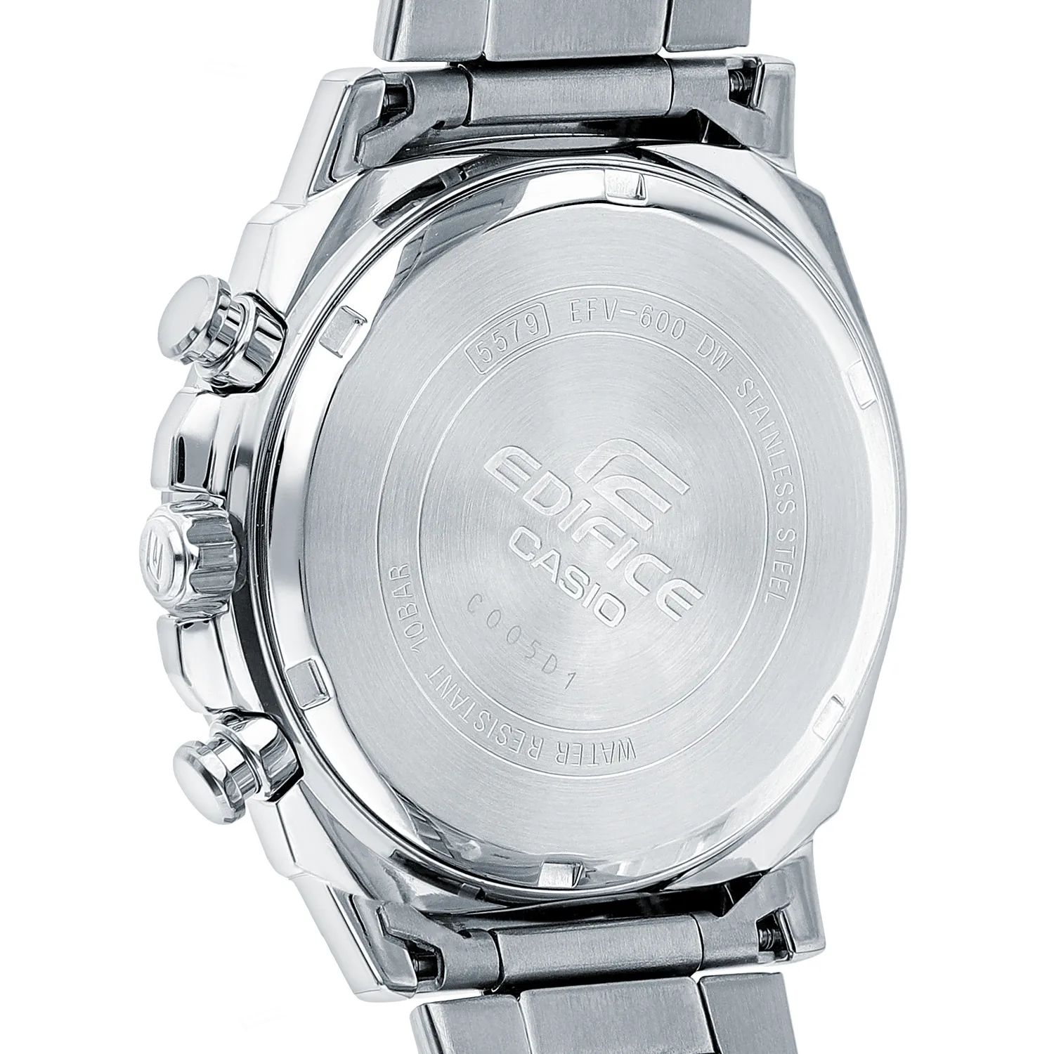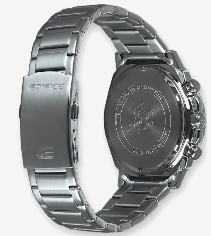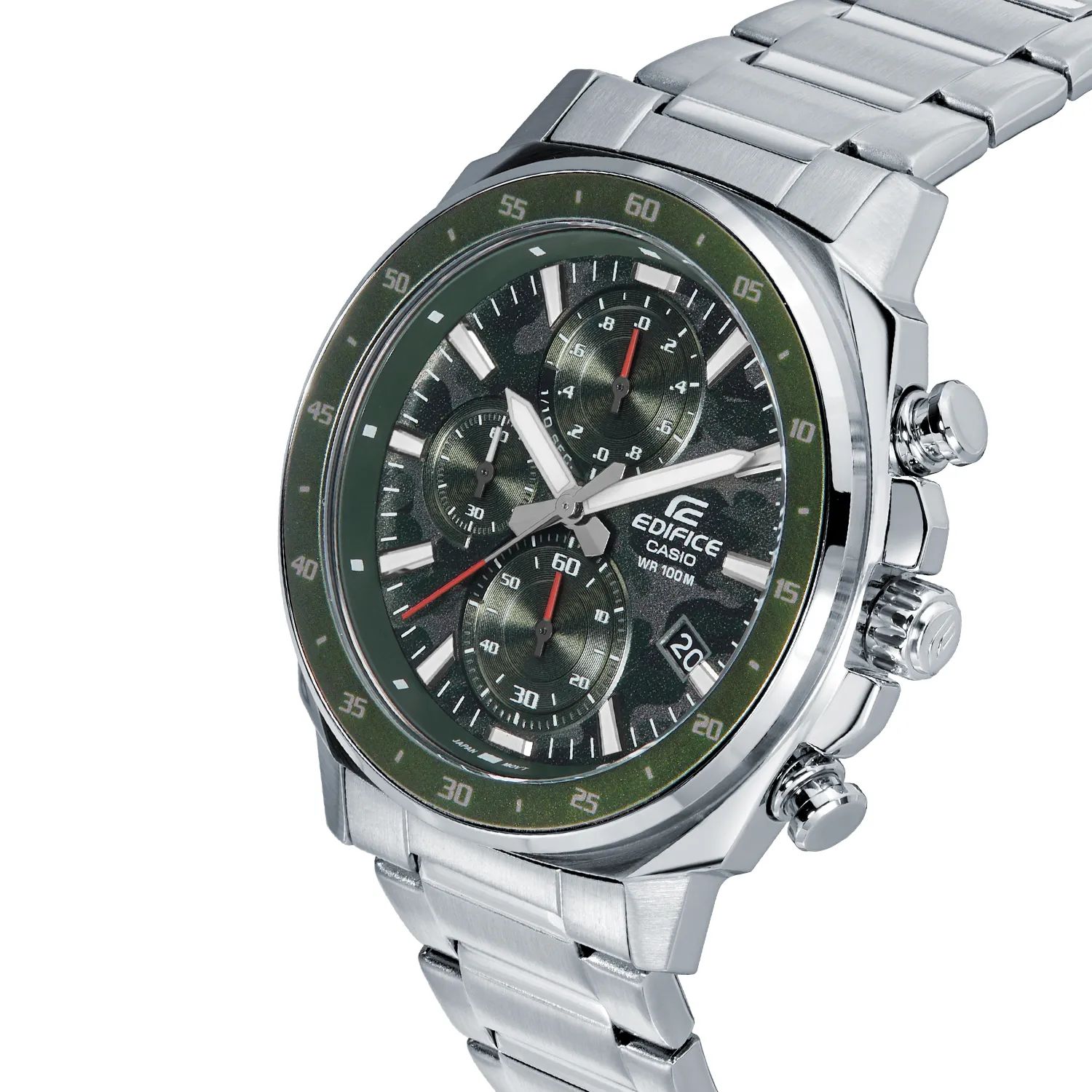 Мужские кварцевые аналоговые часы-хронограф с секундомером. Коллекция Edifice. Центральные часовая, минутная и секундная стрелки. Зелёный циферблат с часовыми метками в виде штрихов. Стрелки и метки с люминесцентным покрытием, которое светится в темноте после непродолжительного воздействия света. Окошко даты в позиции 4 ч. Секундомер с точностью показаний 1/10 с и временем измерения 60 мин. Режимы измерения: прошедшее время, промежуточное время, два финишных результата. Устойчивое к мелким механическим повреждениям минеральное стекло. Круглый корпус из нержавеющей стали с IP покрытием зелёного цвета на безеле. Размер корпуса 43,8 мм на 49 мм, толщина 11,1 мм. Переводная головка с защитой. Минутная шкала на безеле. Завинчивающаяся задняя крышка. Стальной браслет с тройной раскладывающейся застежкой. Батарейка рассчитана на 3 года. Водонепроницаемость WR100 (плавание и погружение без акваланга). Вес примерно 135 г.