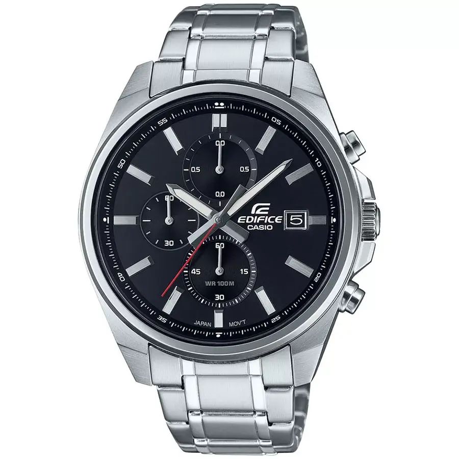 Мужской кварцевый хронограф. Центральные часовая и минутная стрелки, секундная стрелка вынесена на малый циферблат. Апертура даты в позиции 3 часов. Секундомер. Черный циферблат. Круглый корпус выполнен из нержавеющей стали. Диаметр корпуса составляет 44 мм, толщина 11 мм. Заводная головка с защитой. Стальной браслет, раскладывающаяся застежка. Прочное минеральное стекло устойчивое к мелким механическим повреждениям. Водостойкость WR 100 (плавание без погружения). Вес примерно 128 гр.