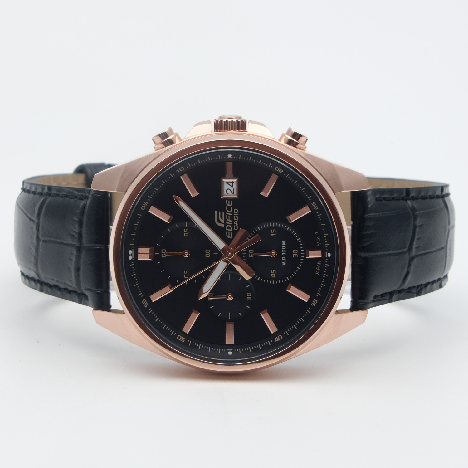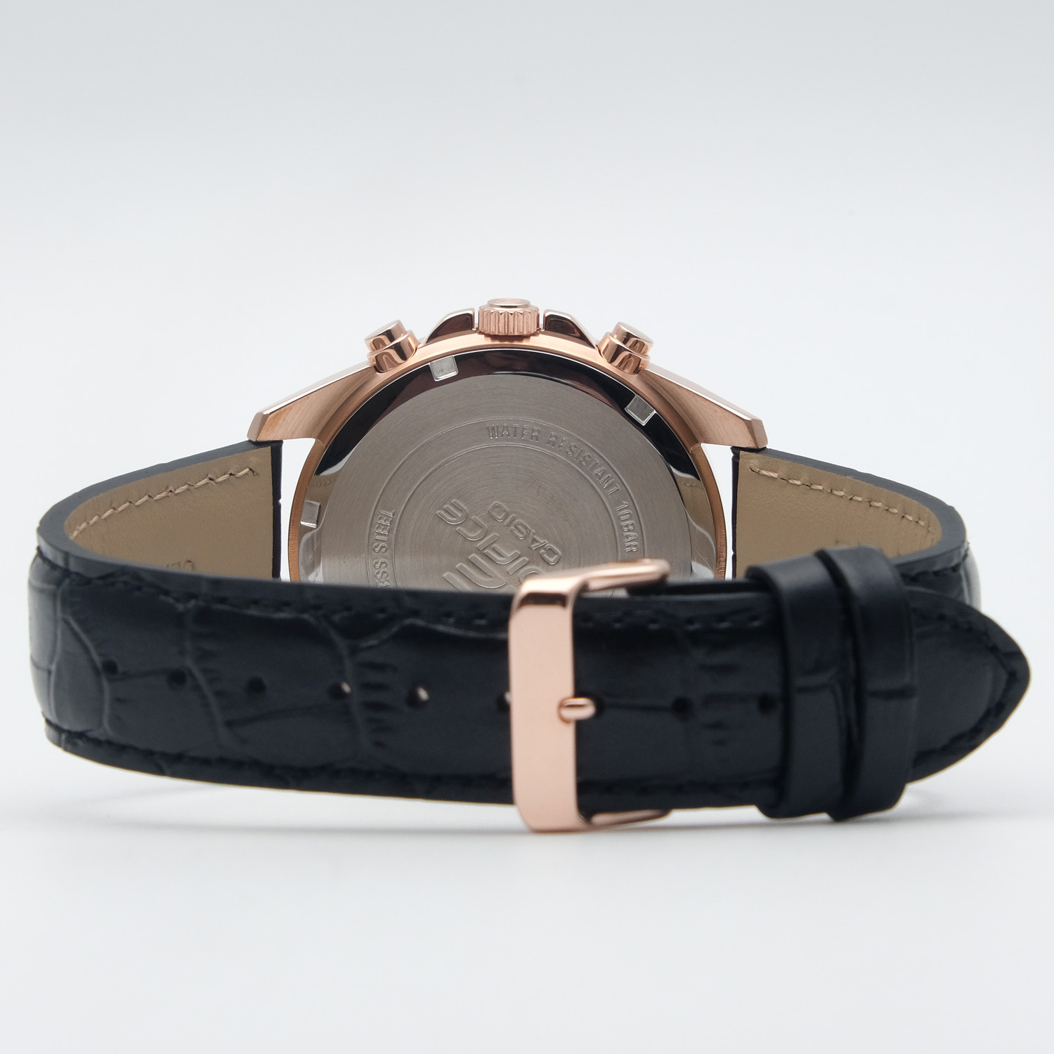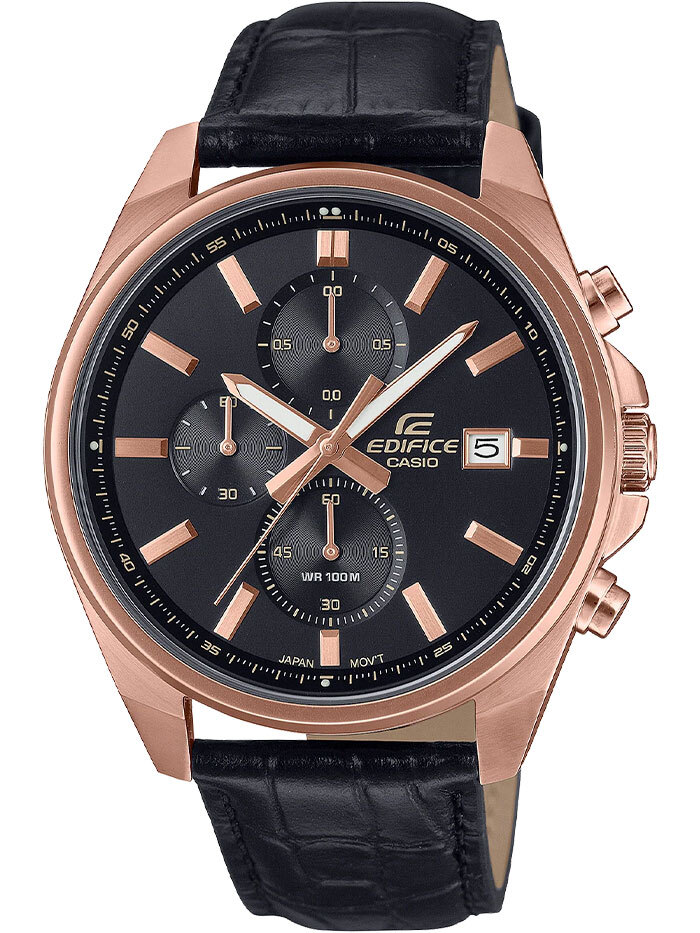 Мужские кварцевые аналоговые часы-хронограф с секундомером. Коллекция Edifice. Центральные часовая, минутная и секундная стрелки. Чёрный циферблат с часовыми метками в виде штрихов. Стрелки и метки с люминесцентным покрытием, которое светится в темноте после непродолжительного воздействия света. Окошко даты в позиции 3 ч. Секундомер с точностью показаний 1/10 с и временем измерения 60 мин. Режимы измерения: прошедшее время, промежуточное время, два финишных результата. Устойчивое к мелким механическим повреждениям минеральное стекло. Круглый корпус из нержавеющей стали с IP покрытием цвета розового золота. Размер корпуса 43,8 мм на 48,6 мм, толщина 11 мм. Переводная головка с защитой. Завинчивающаяся задняя крышка. Чёрный кожаный ремешок с классической застёжкой buckle. Батарейка рассчитана на 2 года. Водонепроницаемость 100WR (часы подходят для плавания с маской, трубкой и обычного плавания). Вес около 72 г.