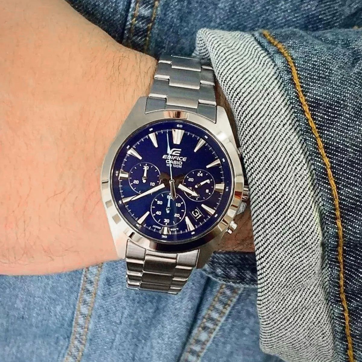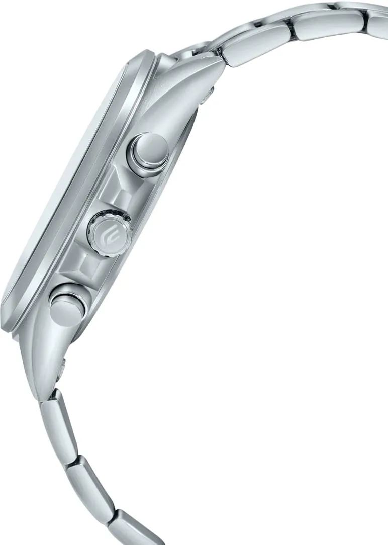 Мужские кварцевые аналоговые часы-хронограф с секундомером. Коллекция Edifice. Центральные часовая, минутная и секундная стрелки. Синий циферблат с часовыми метками в виде штрихов. Стрелки и метки с люминесцентным покрытием, которое светится в темноте после непродолжительного воздействия света. Окошко даты между метками 4 и 5 часов. Секундомер с точностью показаний 1 с и временем измерения 30 мин. Режимы измерения: прошедшее время, промежуточное время, два финишных результата. 12-ти и 24-х часовой формат отображения времени (дополнительный малый циферблат в позиции 3 ч). Устойчивое к мелким механическим повреждениям минеральное стекло. Круглый корпус из нержавеющей стали. Размер корпуса 49,5 мм на 43,9мм, толщина 10,8мм. Переводная головка с защитой. Завинчивающаяся задняя крышка. Стальной браслет с тройной раскладывающейся застежкой. Батарейка рассчитана на 3 года. Водонепроницаемость WR100 (плавание и погружение без акваланга). Вес примерно 130 г.