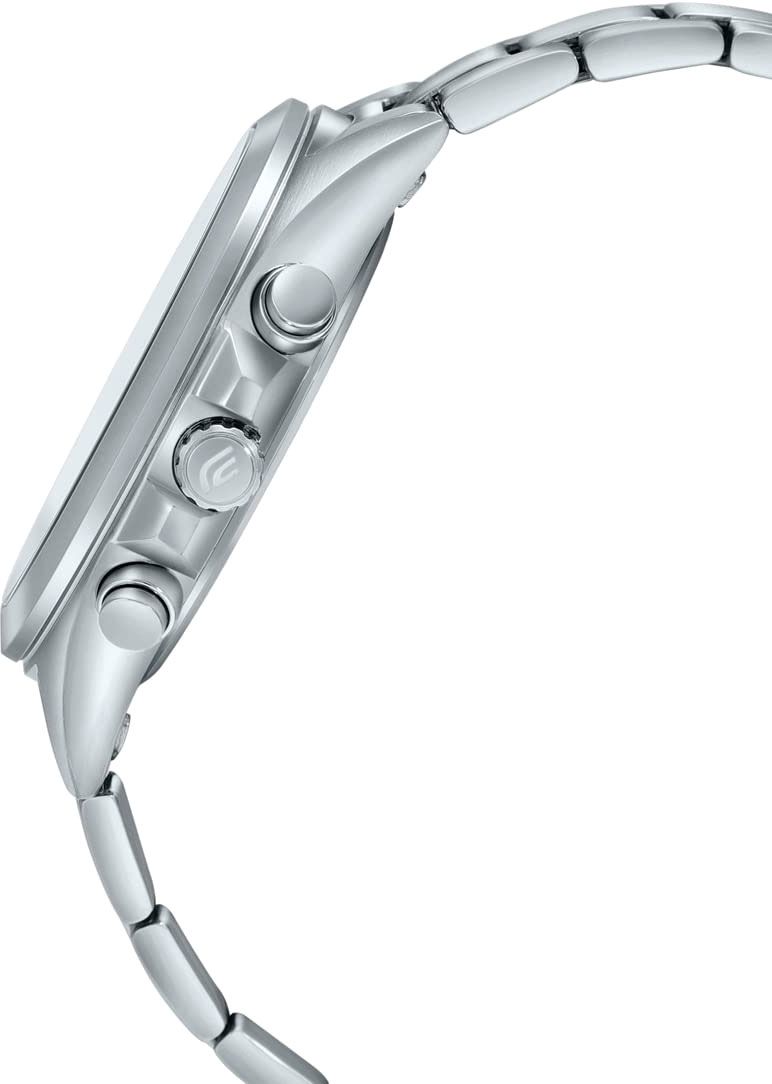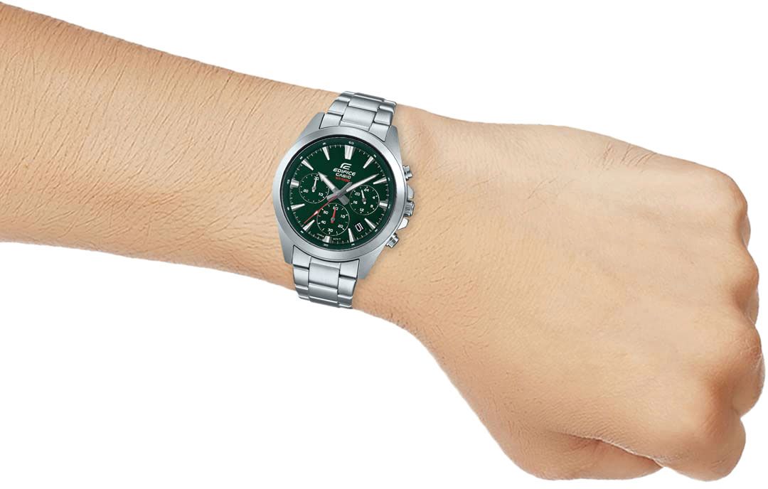 Мужские кварцевые аналоговые часы-хронограф с секундомером. Коллекция Edifice. Центральные часовая, минутная и секундная стрелки. Зелёный циферблат с часовыми метками в виде штрихов. Стрелки и метки с люминесцентным покрытием, которое светится в темноте после непродолжительного воздействия света. Окошко даты между метками 4 и 5 часов. Секундомер с точностью показаний 1 с и временем измерения 30 мин. Режимы измерения: прошедшее время, промежуточное время, два финишных результата. 12-ти и 24-х часовой формат отображения времени (дополнительный малый циферблат в позиции 3 ч). Устойчивое к мелким механическим повреждениям минеральное стекло. Круглый корпус из нержавеющей стали. Размер корпуса 49,5 мм на 43,9мм, толщина 10,8мм. Переводная головка с защитой. Завинчивающаяся задняя крышка. Стальной браслет с тройной раскладывающейся застежкой. Батарейка рассчитана на 3 года. Водонепроницаемость WR100 (плавание и погружение без акваланга). Вес примерно 130 г.