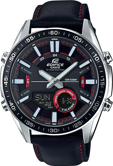 Мужские кварцевые аналогово-цифровые наручные часы. Серия Edifice. Центральные часовая и минутная стрелки. Чёрный циферблат с часовыми метками в виде штрихов. Светонакопительное покрытие стрелок и меток обеспечивает длительное послесвечение в темноте даже после кратковременного воздействия света. 12-ти и 24-х часовой формат отображения времени. Секундомер с точностью показаний 1/100с и временем измерения 24ч. Режимы измерения: прошедшее время, промежуточное время, два финишных результата. Таймер обратного отсчета от 1мин до 24ч (с интервалом в 1 минуту). Мировое время – 30 городов (29 часовых поясов), возможность включения/отключения летнего времени. Записная книжка на 30 ячеек памяти для записи имен и телефонных номеров, каждая запись может включать в себя текст из 8 букв и 16 цифр. 3 независимых будильника (1 с повтором сигнала). Автоматический календарь до 2099 года. Круглый стальной корпус размером 51,6 мм на 46,6 мм, толщиной 14,2 мм. Чёрный кожаный ремешок. Батарея рассчитана на 10 лет. Водонепроницаемость WR 100 (плавание и ныряние без акваланга). Вес около 93 г.