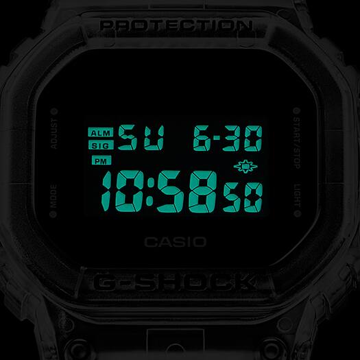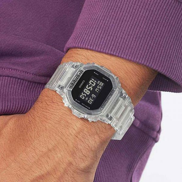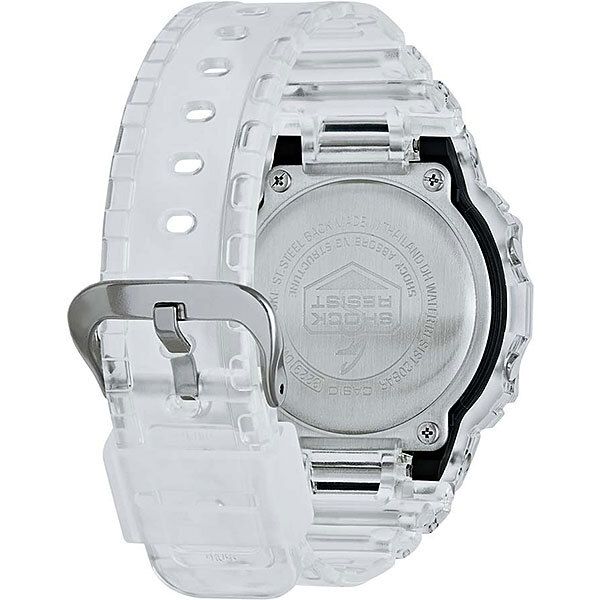 Мужские электронные кварцевые часы. Коллекция G-Shock Skeleton (модель часов с прозрачным корпусом). Противоударный корпус защищает механизм часов от ударов и вибрации. Электролюминесцентная подсветка освещает весь дисплей, функция послесвечения. Световая индикация сигнала (LED-индикатор) - светодиодная лампочка мигает при сигнале будильника, окончании таймера обратного отсчета или секундомера. Секундомер с точностью показаний 1/100 секунды (первый час), 1 секунда (через 1 час) и временем измерения 24 часа. Режимы измерения: прошедшее время, промежуточное время, два финишных результата. Таймер обратного отсчета от 1 секунды до 24 часов с автоповтором. 12-ти и 24-х- часовой формат отображения времени. Многофункциональный будильник, ежедневный звуковой сигнал, индикация начала часа. Автоматический календарь до 2099 г. Чёрный инверсионный ЖК-дисплей (темный фон со светлой индикацией на нем). Прямоугольный корпус из полимерного прозрачного пластика. Размер корпуса 42,8 мм на 48,9 мм, толщина 13,4 мм. Полупрозрачный пластиковый ремешок с классической застежкой buckle. Минеральное стекло устойчивое к мелким механическим повреждениям. Стальная задняя крышка. Батарейка рассчитана на 2 года. Водостойкость WR 200 (плавание и ныряние без акваланга). Вес примерно 53 г.