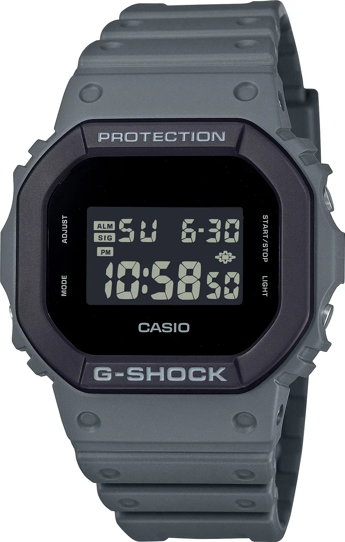 Мужские кварцевые электронные часы. Серия G-Shock. Противоударный корпус защищает механизм часов от ударов и вибрации. Светодиодная подсветка с функцией послесвечения. Световая индикация сигнала (Flash Alert) - мигание подсветки при работе будильника, таймера или секундомера. Секундомер с точностью показаний 1/100 секунды (первый час), 1 секунда (через 1 час) и временем измерения 24 часа. Режимы измерения: прошедшее время, промежуточное время, два финишных результата. Таймер обратного отсчета от 1 секунды до 24 часов с автоповтором. 12-ти и 24-х часовой формат отображения времени. Многофункциональный будильник, сигнал начала часа. Автоматический календарь до 2099 г. Устойчивое к мелким механическим повреждениям минеральное стекло. Прямоугольный корпус из биопластика (изготавливается из возобновляемых органических ресурсов) серого цвета. Размер корпуса 42,8 мм на 48,9 мм , толщина 13,4 мм. Серый ремешок из биопластика (изготавливается из возобновляемых органических ресурсов), стандартная застёжка buckle. Срок службы батареи около 5 лет. Водостойкость WR 200 (плавание и ныряние без акваланга). Вес примерно 52 г.