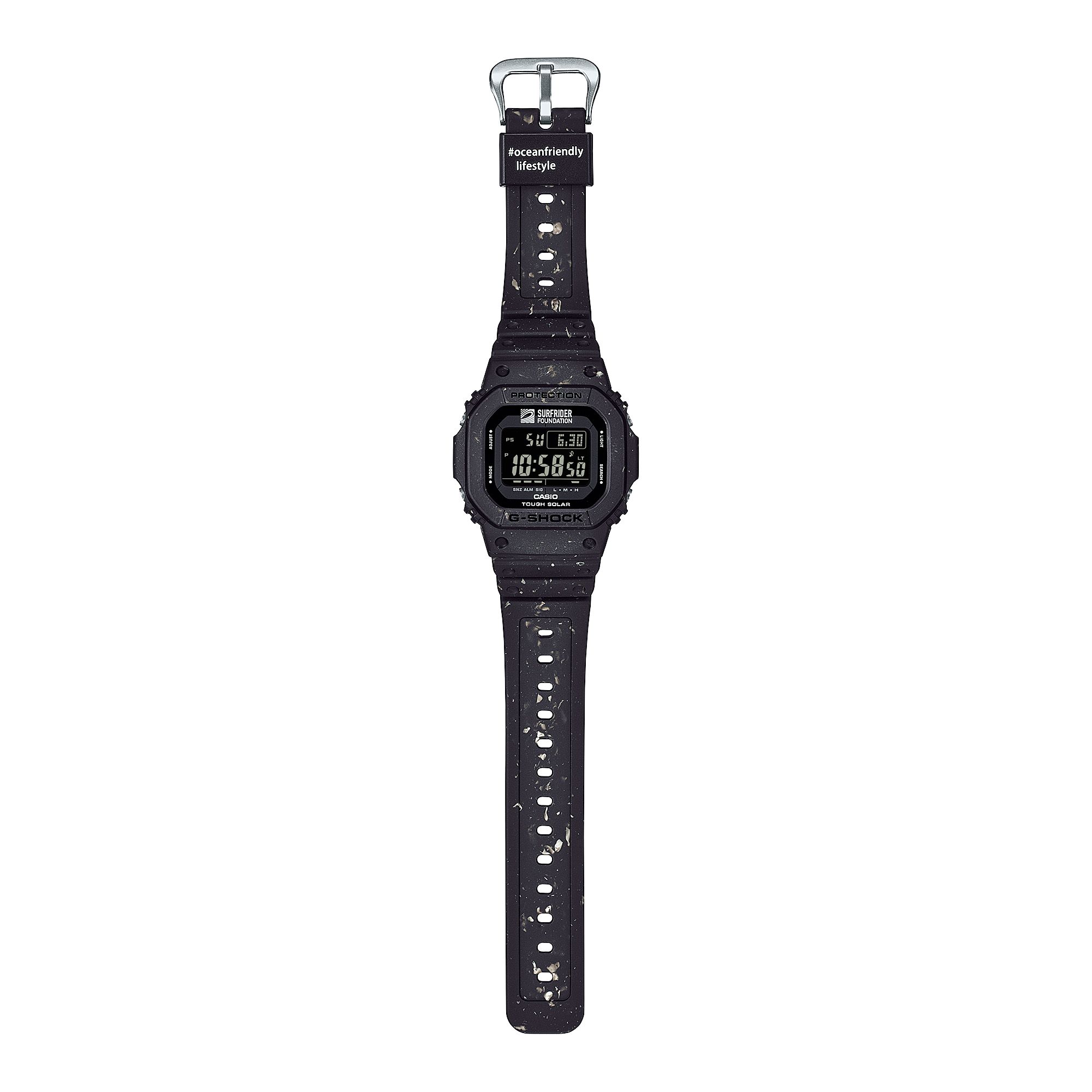 Мужские кварцевые электронные наручные часы. Серия G-Shock limited. Специальная серия, созданная совместно с Фондом Surfrider Foundation, некоммерческой организацией из США, основанной серферами-любителями и отвечающей за защиту водных ресурсов нашей планеты от загрязнений. На дисплее и задней крышке размещен логотип Surfrider Foundation, а на держателе ремешка напечатан хештег “#oceanFriendly Lifestyle” (Дружественный океану образ жизни) с намеком на жизнь в гармонии с океаном и природой. Питание от солнечной энергии Tought Solar- источником питания служит светочувствительная панель и аккумулятор, который заряжается от солнечных лучей. Функция автоматического сохранения энергии (в темноте дисплей гаснет для экономии энергии). Время работы аккумулятора без подзарядки около 12 месяцев, при включенной функции сохранения энергии около 22 месяцев. Индикатор уровня заряда батареи. Противоударный корпус защищает механизм часов от ударов и вибрации. Полностью автоматическая светодиодная подсветка (Super Illuminator), при недостаточном освещении поворот руки обеспечит автоматическое включение подсветки дисплея. Настраиваемое послесвечение 1,5 или 3с. 12-ти и 24-х часовой формат отображения времени. Секундомер с точностью измерения 1/100 секунды (первые 60 минут), и 1 секунда (через 60 минут) и временем измерения 24ч. Режимы измерения: прошедшее время, промежуточное время, два финишных результата. Таймер обратного отсчета от 1с до 24ч. Мировое время – 48 городов (31 часовой пояс), всемирное координированное время (UTC). Переключение между домашним и мировым временем. Возможность выбора до 5 городов в качестве избранных в WorldTime. Переход на зимнее и летнее время, возможность включения/отключения данной функции. Автоматический календарь до 2099г. Отображение дней недели на шести языках. Функция включения/отключения звука кнопок. 5 ежедневных будильников (один с функцией повтора сигнала), ежечасный сигнал. Прямоугольный корпус из вторичного (переработанного) пластика чёрного цвета. Размеры корпуса 43,2 мм на 46,7мм, толщина 12,7мм. Устойчивое к мелким механическим повреждениям минеральное стекло. Стальная задняя крышка. Чёрный ремешок из вторичного (переработанного) пластика с классической застежкой buckle. Водонепроницаемость WR200 (плавание и ныряние без акваланга). Вес около 47г. Специальная коробка для часов, кейс в форме буквы G и хлопковый мешочек — все компоненты комплекта выполнены из переработанных и натуральных материалов.