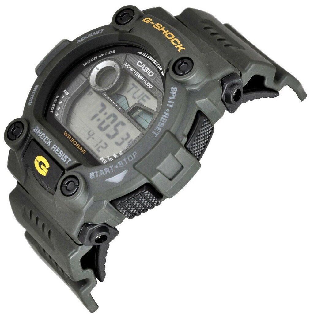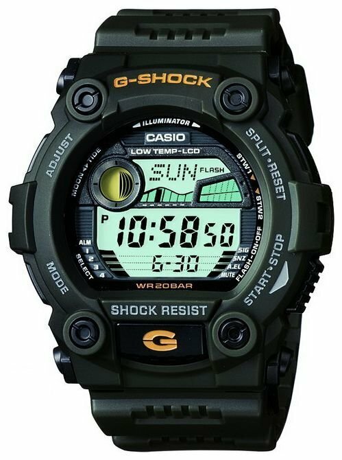 Электролюминесцентная подсветка освещает весь циферблат. При повороте часов в сторону лица, подсветка включается автоматически. Противоударный корпус защищает механизм от ударов и вибрации. Мировое время. Отображение возраста и фазы Луны. Графическое отображение сведений о приливах и отливах. 12-ти и 24-х часовой формат времени. Два секундомера с точностью показаний 1/100 сек и временем измерения 1000 часов. Таймер обратного отсчета от 1мин до 24ч. Модуль часов рассчитан на работу при низких температурах. Отключение звука.
