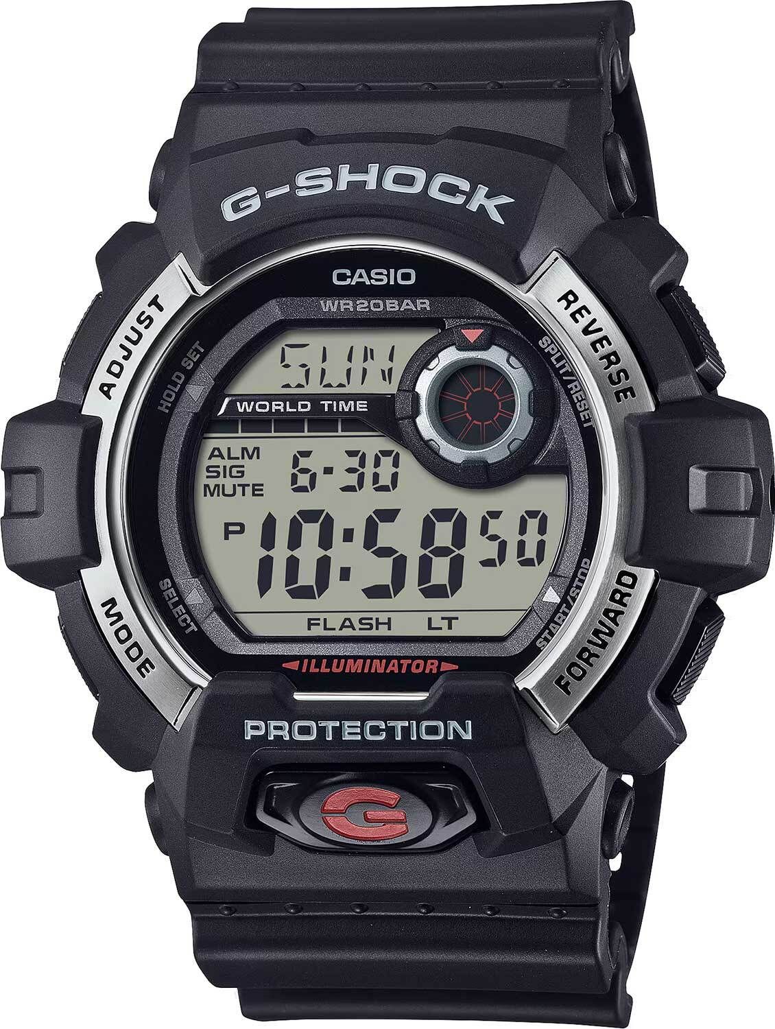 Мужские кварцевые электронные часы. Коллекция G-Shock. Противоударный корпус защищает механизм часов от ударов и вибрации. Автоматическая светодиодная подсветка с функцией послесвечения - при недостаточной освещенности поворот руки включит подсветку часов. Световой сигнал (LED-индикатор) - светодиодная лампочка мигает при сигнале будильника, окончании таймера обратного отсчета или секундомера. Секундомер с точностью показаний 1/100 секунды и временем измерения 24 часа. Режимы измерения: прошедшее время, промежуточное время, два финишных результата. Таймер обратного отсчета от 1 секунды до 24 часов с автоповтором. 12-ти и 24-х часовой формат отображения времени. 5 ежедневных или одноразовых будильников, индикация начала часа. Автоматический календарь до 2099 г. Мировое время : 48 городов (31 часовой пояс), всемирное координированное время (UTC), переключение между домашним и мировым временем. Возможность выбора до 4 городов в качестве избранных. Переход на зимнее и летнее время, возможность включения/отключения данной функции. Функция включения/отключения звука кнопок. Круглый корпус из полимерного пластика чёрного цвета. Размер корпуса 52,5 мм на 55,1 мм , толщина 16,3 мм. Стальной безель. . Чёрный пластиковый ремешок с классической застежкой buckle. Минеральное стекло устойчивое к мелким механическим повреждениям. Батарейка рассчитана на 3 года. Водостойкость WR 200 (плавание и ныряние без акваланга). Вес около 69 г.
