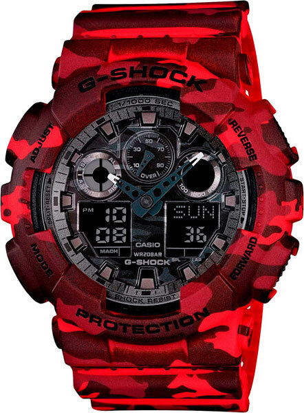 Мужские кварцевые наручные часы c аналого-цифровым отображением времени. Серия Casio G-Shock. Противоударный корпус защищает механизм часов от ударов и вибрации. Часы созданы с защитой от воздействия магнитных полей. Автоматическая светодиодная подсветка — при недостаточном освещении поворот руки включает подсветку циферблата, выбор продолжительности подсветки 1,5 или 3 секунды, послесвечение. Мировое время – 48 городов (29 часовых поясов), всемирное координированное время (UTC), атоматический переход на зимнее и летнее время, возможность включения/отключения данной функции. 12-ти и 24-х часовой формат отображения времени. Секундомер с точностью показаний 1/1000 с и временем измерения 100 часов. Режимы измерения: пройденное время, время круга, промежуточное время. Расчет скорости по выбранной дистанции. Таймер обратного отсчета от 1 мин до 24 ч (с интервалом в 1 минуту и с интервалом в 1 час) с автоповтором. 5 ежедневных будильников, один с функцией повтора сигнала (Snooze), ежечасный сигнал. Расчет скорости по выбранной дистанции. Автоматический календарь до 2099 года. Серый циферблат с часовыми метками в виде штрихов. Центральные часовая и минутная стрелки. Круглый корпус из полимерного пластика красного цвета с камуфляжным рисунком. Размер корпуса 55 мм на 51,2мм, толщина 16,9мм. Устойчивое к мелким механическим повреждениям минеральное стекло. Красный пластиковый ремешок с камуфляжным рисунком, классическая застежка buckle. Батарейка рассчитана на 2 года. Водонепроницаемость 200 WR (плавание и ныряние без акваланга). Вес около 72 г.