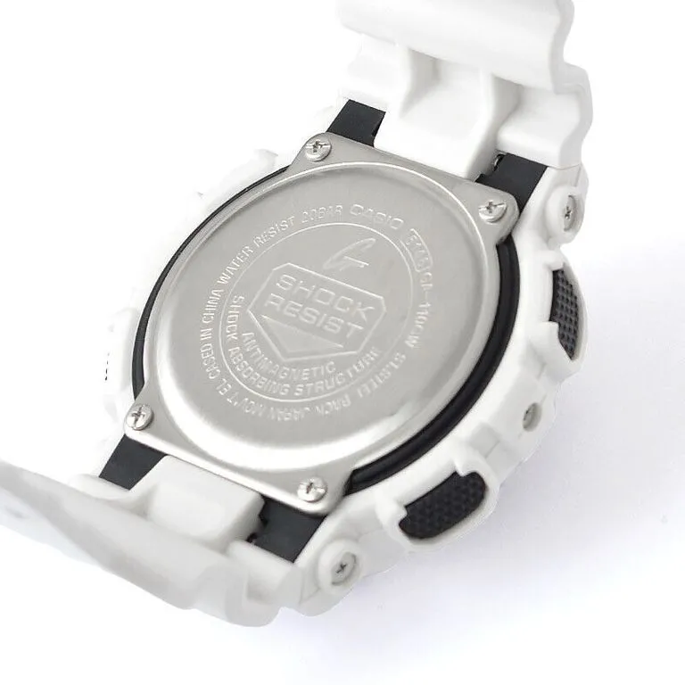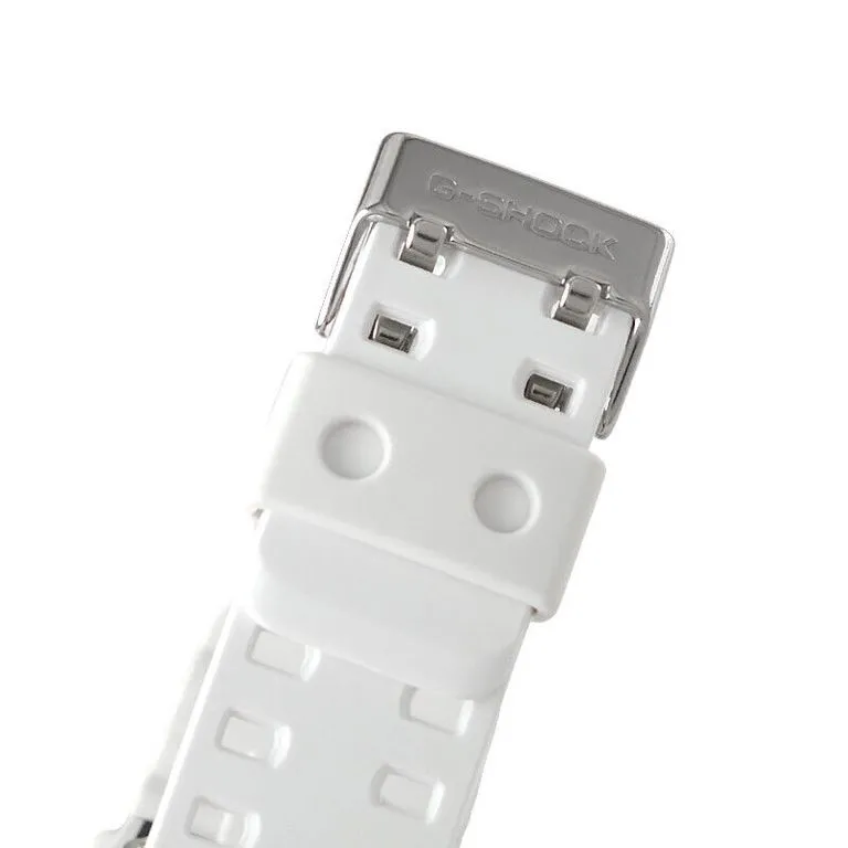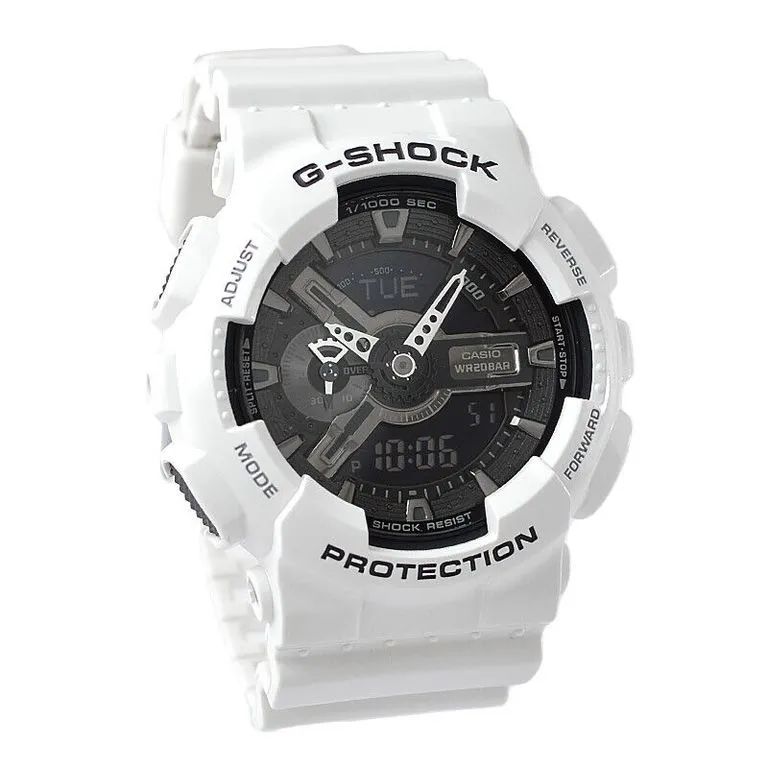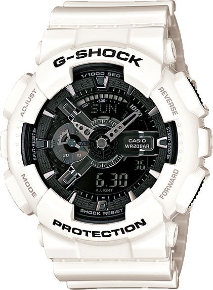 Мужские кварцевые наручные часы c аналого-цифровым отображением времени. Серия Casio G-Shock. Противоударный корпус защищает механизм часов от ударов и вибрации. Часы созданы с защитой от воздействия магнитных полей. Автоматическая светодиодная подсветка — при недостаточном освещении поворот руки включает подсветку циферблата, выбор продолжительности подсветки 1,5 или 3 секунды, послесвечение. Необритовое светонакопительное покрытие стрелок обеспечивает длительное послесвечение в темноте после кратковременного воздействия света. Мировое время – 48 городов (29 часовых поясов), всемирное координированное время (UTC). Автоматический переход на зимнее и летнее время, возможность включения/отключения данной функции. Переключение между домашним и мировым временем. 12-ти и 24-х часовой формат отображения времени. Секундомер с точностью показаний 1/1000 с и временем измерения 100 ч. Режимы измерения:прошедшее время, промежуточное время, два финишных результата. Расчет скорости по выбранной дистанции. Таймер обратного отсчета от 1 мин до 24 часов с автоповтором. 5 ежедневных будильников, один с функцией повтора сигнала Snooze, ежечасный сигнал. Автоматический календарь до 2099 года. Круглый корпус из полимерного пластика белого цвета. Устойчивое к мелким механическим повреждениям минеральное стекло. Пластиковый ремешок белого цвета с классической застежкой Buckle. Батарея рассчитана на 2 года. Водонепроницаемость 200 WR (плавание и ныряние без акваланга). Вес около 72 г.