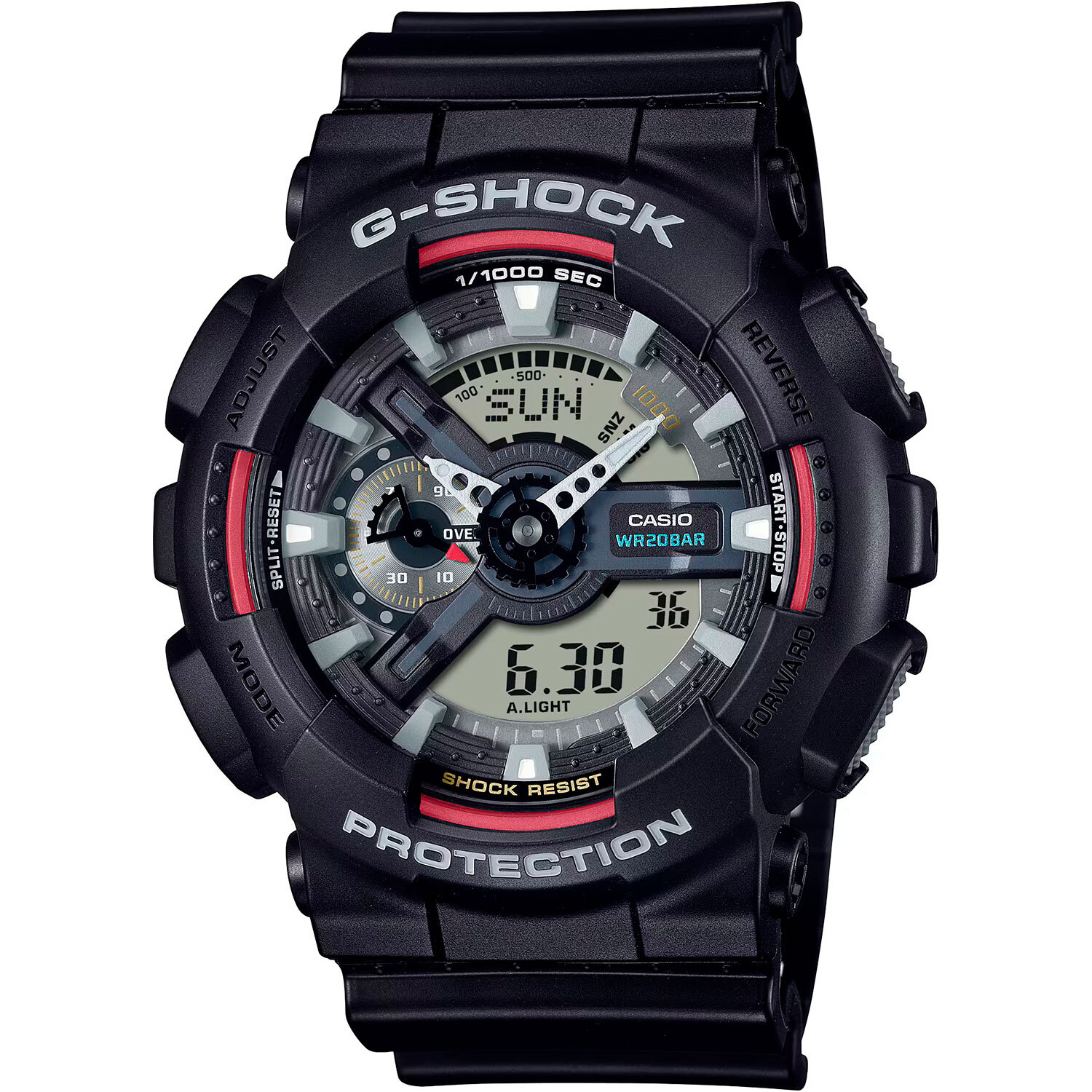Мужские кварцевые аналого-цифровые часы. Коллекция G-Shock. Противоударный корпус защищает механизм часов от ударов и вибрации. Часы созданы с защитой от магнитных полей. Светодиодная автоподсветка - поворот руки при недостаточном освещении обеспечит автоматическое включение подсветки циферблата. Выбор продолжительности подсветки 1,5 или 3 секунды, послесвечение. Светонакопительное покрытие стрелок обеспечивает длительное послесвечение в темноте после кратковременного воздействия света. Секундомер с точностью показаний 1/1000 секунды и временем измерения 100 ч. Режимы измерения: прошедшее время, промежуточное время, время круга. Таймер обратного отсчета от 1 минуты до 24 часов с функцией автоповтора и звуковым сигналом в установленное время. 12-ти и 24-х часовой формат отображения времени. Расчет скорости по выбранной дистанции. 5 ежедневных будильников, один с функцией повтора сигнала (Snooze), почасовой сигнал времени. Мировое время – 48 городов (29 часовых поясов), всемирное координированное время (UTC), включение/отключение летнего времени, переключение между домашним и мировым временем. Автоматический календарь до 2099 г. Круглый корпус из биопластика (изготавливается из возобновляемых органических ресурсов) чёрного цвета. Размер корпуса 51,2 мм на 55 мм , толщина 16,9 мм. Минеральное стекло устойчивое к мелким механическим повреждениям. Чёрный ремешок из биопластика (изготавливается из возобновляемых органических ресурсов) с классической застежкой. Батарейка рассчитана на 2 года. Водостойкость WR 200 (плавание и ныряние без акваланга). Вес примерно 72 г.