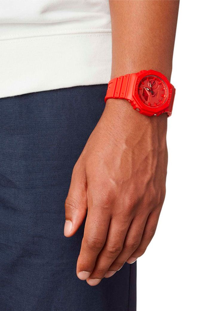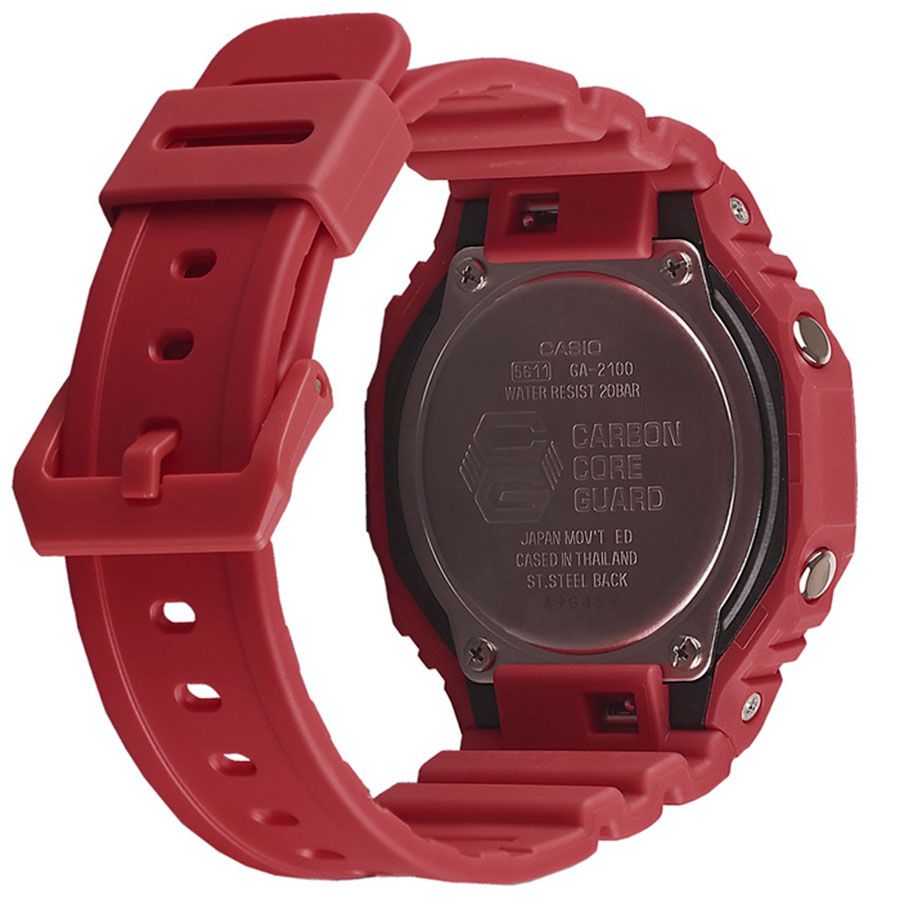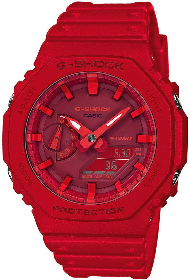 Мужские кварцевые аналого-цифровые наручные часы. Серия G-Shock. Противоударный пластиковый корпус с углеродными волокнами (структура Carbon Core Guard) более прочный и в то же время более легкий, защищает механизм часов от ударов и вибраций. Двойная светодиодная подсветка обеспечивает подсветку не только цифрового дисплея, но и аналогового циферблата. Настройка продолжительности подсветки 1,5 или 3 секунды, послесвечение. Светящееся покрытие стрелок обеспечивает длительное послесвечение в темноте даже после короткого воздействия света. 12-ти и 24-х часовой формат отображения времени. Секундомер с точностью показаний 1/100 с (первый час) и 1 с (после первого часа) и временем измерения 24 часа. Режимы измерения: прошедшее время, промежуточное время, два финишных результата. Таймер обратного отсчета от 1 секунды до 24 часов с автоповтором. Мировое время - 31 часовой пояс (48 городов), всемирное координированное время (UTC), включение/отключение летнего времени. 5 ежедневных будильников, ежечасный сигнал. Функция перемещения стрелок для удобного просмотра информации на цифровом экране. Ретроградный стрелочный указатель для недели. Функция отключения/включения звука кнопок. Автоматический календарь до 2099 года. Усиленный углеродными волокнами пластиковый восьмиугольный корпус красного цвета. Размер корпуса 45,4 мм на 48,5мм, толщина 11,8мм. Устойчивое к мелким механическим повреждениям минеральное стекло. Красный циферблат с часовыми метками в виде штрихов. Красный пластиковый ремешок со стандартной застёжкой Buckle. Примерный срок службы батареи 3 года. Водонепроницаемость 200WR (плавание и ныряние без акваланга). Вес около 51 г.