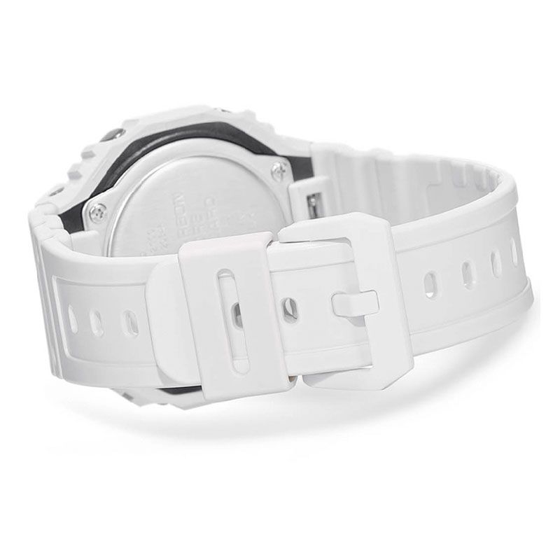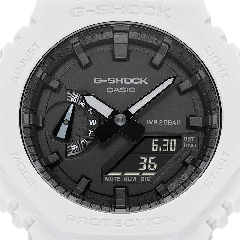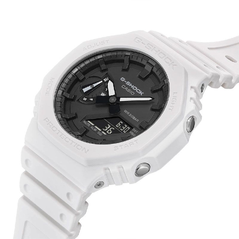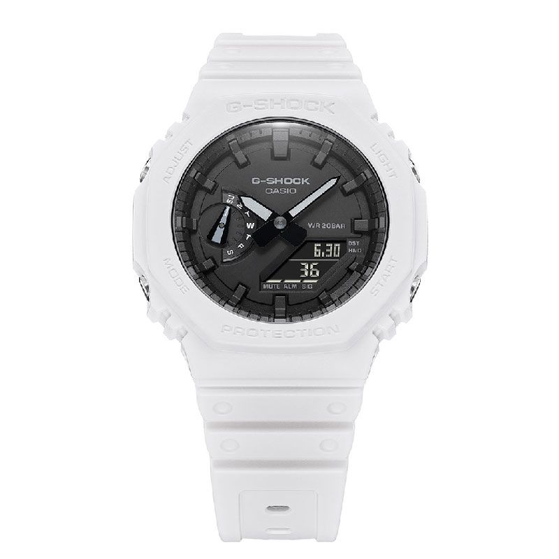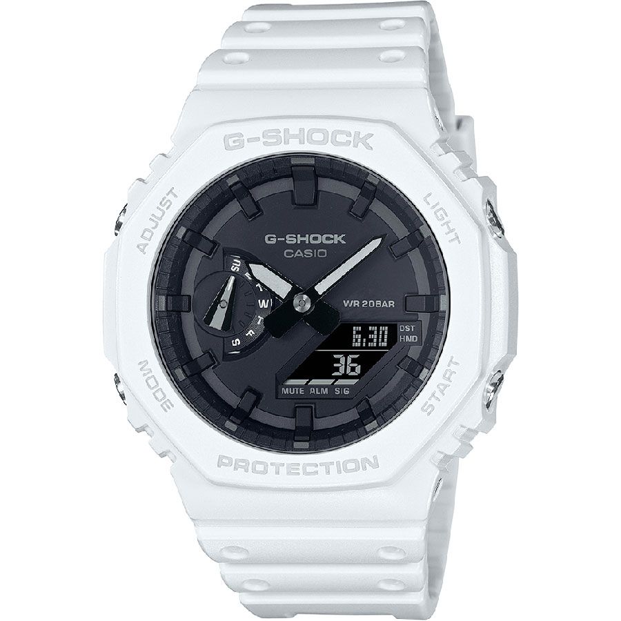Мужские кварцевые аналого-цифровые наручные часы. Серия G-Shock. Противоударный пластиковый корпус с углеродными волокнами (структура Carbon Core Guard) более прочный и в то же время более легкий, защищает механизм часов от ударов и вибраций. Двойная светодиодная подсветка обеспечивает подсветку не только цифрового дисплея, но и аналогового циферблата. Настройка продолжительности подсветки 1,5 или 3 секунды, послесвечение. Светящееся покрытие стрелок обеспечивает длительное послесвечение в темноте даже после короткого воздействия света. 12-ти и 24-х часовой формат отображения времени. Секундомер с точностью показаний 1/100 с (первый час) и 1 с (после первого часа) и временем измерения 24 часа. Режимы измерения: прошедшее время, промежуточное время, два финишных результата. Таймер обратного отсчета от 1 секунды до 24 часов с автоповтором. Мировое время - 31 часовой пояс (48 городов), всемирное координированное время (UTC), включение/отключение летнего времени. 5 ежедневных будильников, ежечасный сигнал. Функция перемещения стрелок для удобного просмотра информации на цифровом экране. Ретроградный стрелочный указатель для недели. Функция отключения/включения звука кнопок. Автоматический календарь до 2099 года. Усиленный углеродными волокнами пластиковый восьмиугольный корпус белого цвета. Размер корпуса 45,4 мм на 48,5мм, толщина 11,8мм. Устойчивое к мелким механическим повреждениям минеральное стекло. Чёрный циферблат с часовыми метками в виде штрихов. Белый пластиковый ремешок со стандартной застёжкой Buckle. Примерный срок службы батареи 3 года. Водонепроницаемость 200WR (плавание и ныряние без акваланга). Вес около 51 г.