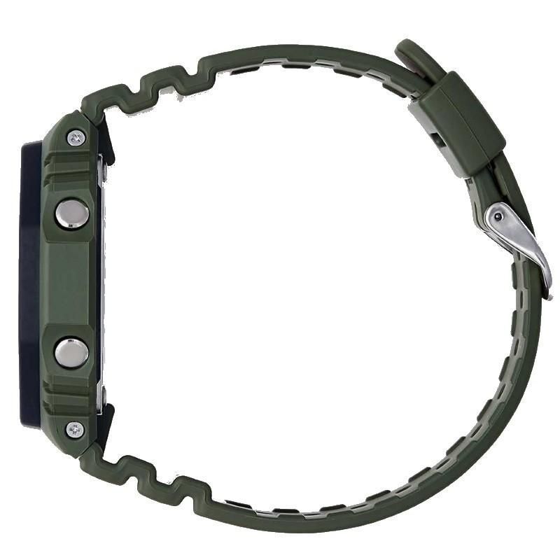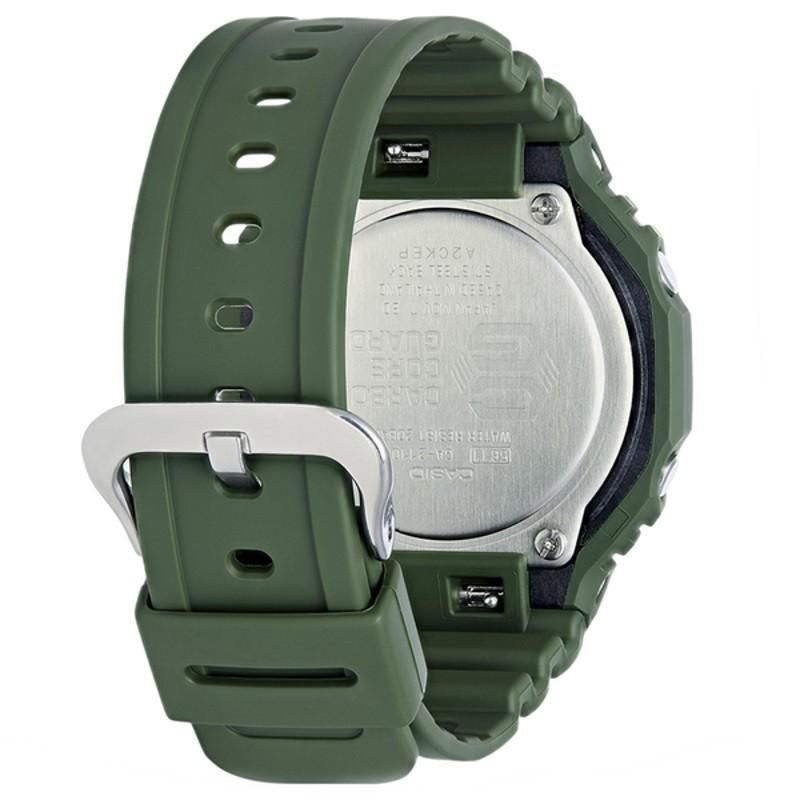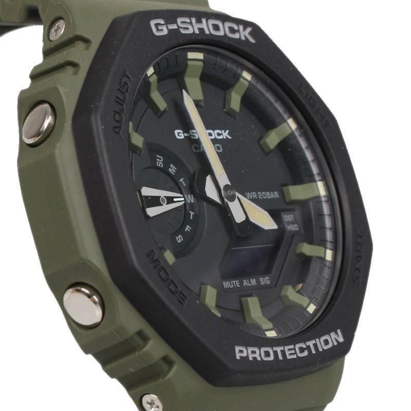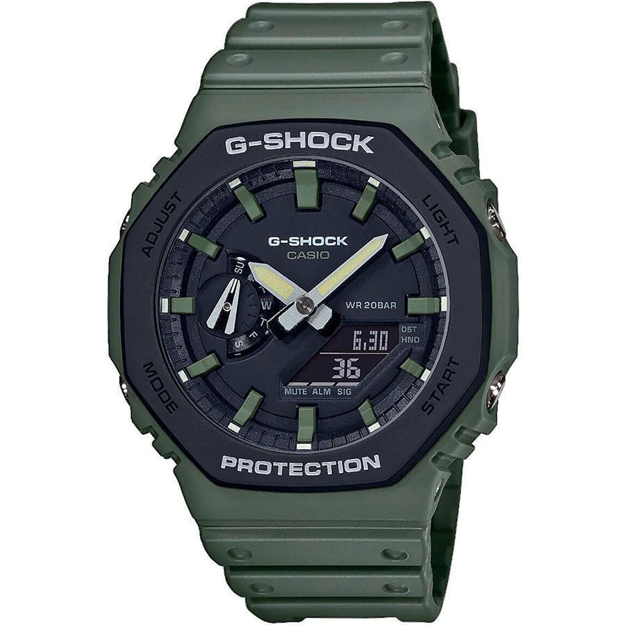 Мужские кварцевые аналого-цифровые наручные часы. Серия G-Shock Carbon Core Guard. Противоударный пластиковый корпус с карбоновыми волокнами более прочный и в то же время более легкий, защищает механизм часов от ударов и вибраций. Двойная светодиодная подсветка обеспечивает подсветку не только аналогового циферблата, но и цифрового дисплея. Настройка продолжительности подсветки 1,5 или 3 секунды. Необритовое светонакопительное покрытие стрелок обеспечивает длительное послесвечение в темноте после непродолжительного воздействия света. Мировое время – 48 городов (31 часовой пояс), всемирное координированное время (UTC). Функция включения/отключения летнего времени. Секундомер с точностью показаний 1/100с (до 1ч) и 1с (после 1ч) и временем измерения 24 часа. Режимы измерения: прошедшее время, промежуточное время, два финишных результата. Таймер обратного отсчета от 1c до 24ч. 5 ежедневных будильников, сигнал начала часа. Функция перемещения стрелок для удобного просмотра информации на цифровом экране. Включение/выключение звука кнопок. Автоматический календарь до 2099 года. 12/24х часовой формат отображения времени. Ретроградный стрелочный указатель для недели на отдельном малом циферблате в позиции 9 ч. Усиленный углеродными волокнами пластиковый корпус зелёного цвета с чёрным безелеи. Размеры корпуса 45,4 мм на 48,5 мм, толщина 11,8 мм. Зелёный пластиковый ремешок с классической застежкой buckle. Минеральное стекло устойчивое к мелким механическим повреждениям. Водонепроницаемость WR200 (плавание и погружение без акваланга). Вес около 51 г.