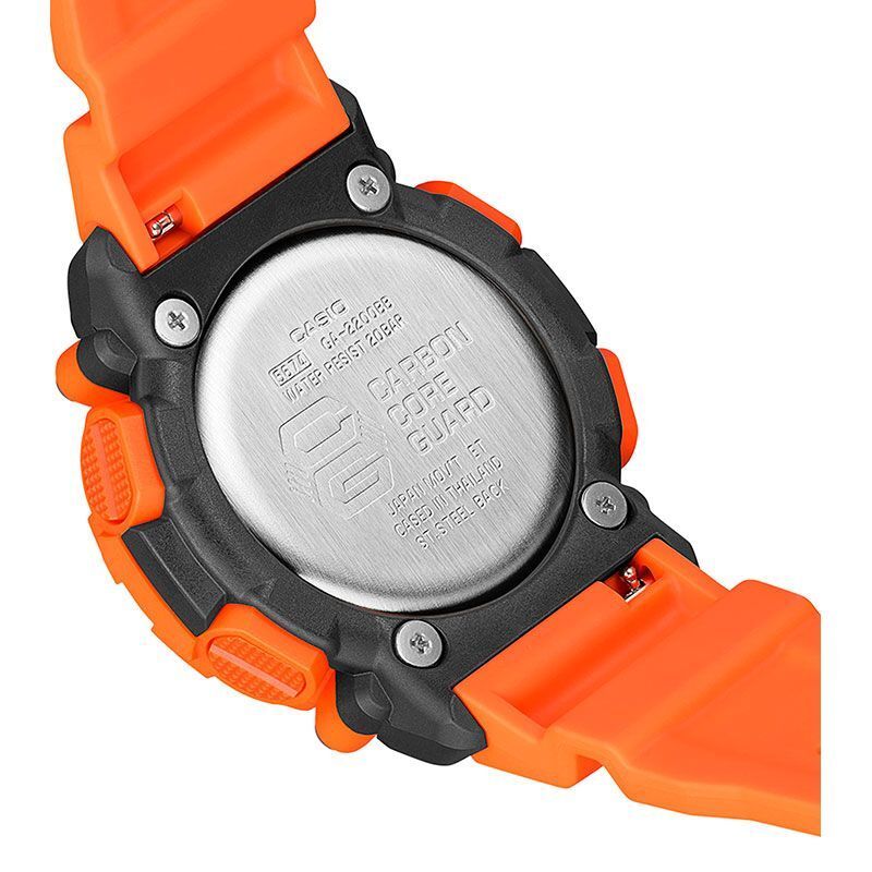 Мужские кварцевые аналого-цифровые наручные часы. Коллекция Casio G-Shock. Противоударный пластиковый корпус с углеродными волокнами (структура Carbon Core Guard) более прочный и, в то же время, более легкий, защищает внутренний модуль часов от повреждений и деформаций при ударах. Двойная светодиодная подсветка Super Illuminator обеспечивает подсветку не только аналогового циферблата, но и цифрового дисплея, настройка продолжительности подсветки 1,5 или 3 секунды, послесвечение. Необритовое светонакопительное покрытие стрелок обеспечивает длительное послесвечение в темноте после кратковременного воздействия света. 12-ти и 24-х часовой формат отображения времени. Секундомер с точностью показаний 1/100 секунды (первый час) и 1 секунда (после первого часа) и временем измерения 24ч. Режимы измерения: прошедшее время, промежуточное время, два финишных результата. Таймер обратного отсчета от 1с до 24ч (с интервалом в 1 секунду), 10-секундный сигнал об окончании обратного отсчета. Мировое время – 48 городов (31 часовой пояс), всемирное координированное время (UTC). Функция включения/отключения летнего времени. Переключение между домашним и мировым временем. Автоматический календарь до 2099 г. 5 ежедневных будильников, сигнал начала часа, продолжительность звучания сигнала 10 секунд. Функция отключения/включения звука кнопок. Функция перемещения стрелок для удобного просмотра информации на цифровом экране. Усиленный углеродными волокнами пластиковый корпус оранжевого цвета. Размеры корпуса 47,1 мм на 50,8мм, толщина 12,8мм. Чёрный циферблат с часовыми метками в виде штрихов. Устойчивое к мелким механическим повреждениям минеральное стекло. Стальная задняя крышка. Оранжевый пластиковый ремешок с классической застежкой buckle. Батарея рассчитана на 3 года. Водонепроницаемость 200 WR (плавание и ныряние без акваланга). Вес около 57 г.