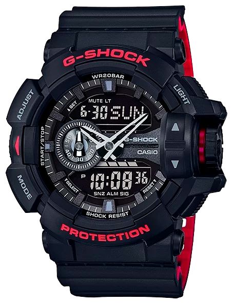 Мужские кварцевые аналогово-цифровые наручные часы. Серия Casio G-Shock. Ударопрочная конструкция защищает механизм часов от ударов и вибрации. Автоматическая светодиодная подсветка - циферблат подсвечивается светодиодом, функция автоподсветки освещает циферблат при повороте часов к лицу. Мировое время, 31 часовая зона (48 городов + всеобщее скоординированное время). Time Zone — отображение текущего времени в 4-х разных часовых поясах- можно легко и просто переключаться между отображением текущего времени в 4-х разных часовых поясах. Секундомер с точностью показаний 1/100 с -24 часа. - прошедшее время измеряется с точностью в 1/100 секунды, пределы измерения достигают 24 часов. Таймер обратного отсчета времени от 1 минуты до 1 часа. 5 будильников (1 с функцией повтора сигнала). Ежечасный сигнал. Автоматический календарь (до 2099 года). 12/24-х часовой формат времени. Включение/выключение звука кнопок. Функция перемещения стрелок Функция колеса прокрутки - помощью колеса прокрутки сможете легко интуитивно настраивать время, будильник и таймер. Корпус и ремешок выполнены из полимерного материала.