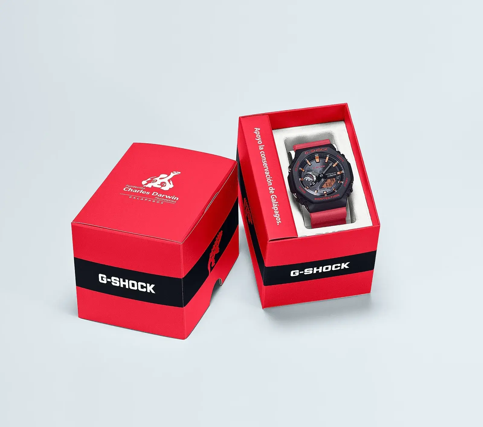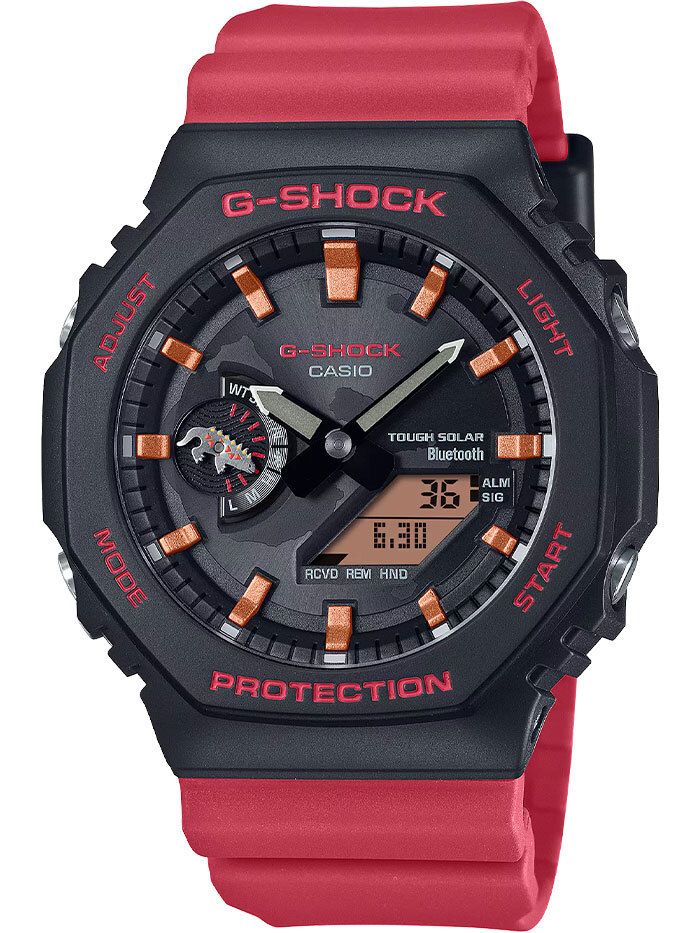 Мужские кварцевые аналого-цифровые часы на солнечной батарее. Серия G-Shock limited. Лимитированная модель (выпущена ограниченным тиражом), разработанная в сотрудничестве Casio с Фондом имени Чарльза Дарвина, организацией, которая занимается охраной окружающей среды на Галапагосских островах. Именно там в 1835 году Чарльзу Дарвину пришла идея о его теории эволюции. Данная модель часов посвящена Галапагосской морской игуане. Красно-чёрная гамма часов соответствует окраске галапагосской морской игуаны — единственной в мире игуаны, которая плавает в море. Противоударный пластиковый корпус с углеродными волокнами (структура Carbon Core Guard) защищает внутренний модуль часов от повреждений и деформаций при ударах и вибрации. Питание от солнечной энергии Tough Solar — источником питания служит светочувствительная панель и аккумулятор, который заряжается при попадании солнечных лучей на циферблат часов. Запас хода при полном заряде аккумулятора до 7 месяцев. Часы оснащены беспроводной технологией Bluetooth® со сверхнизким потреблением энергии для синхронизации со смартфоном. При подключении к смартфону часы автоматически корректируют текущее время и получают доступ к ряду полезных функций. Двойная светодиодная подсветка, послесвечение, настройка продолжительности подсветки 1,5 или 3 с. Секундомер с точностью измерения 1/100 секунды (в течение первого часа), 1 секунда (через 1 час) и временем измерения 24ч. Режимы измерения: прошедшее время, время прохождения части и круга дистанции. Таймер обратного отсчета от 1 секунды до 60 минут с интервалом в 1 секунду. 5 ежедневных будильников, ежечасный сигнал. Мировое время - 38 городов (38 часовых поясов), всемирное координированное время (UTC). Функция включения/отключения летнего времени. Переключение между домашним и мировым временем. 12-ти и 24-х часовой формат отображения времени. Автоматический календарь до 2099 г. Отображение дней недели на шести языках. Включение/выключение звука кнопок. Функция перемещения стрелок для удобного просмотра информации на цифровом дисплее. Индикатор заряда батареи. Стрелка индикатора режима часов у метки девяти часов выполнена в виде силуэта морской игуаны. Функция сохранения энергии. Функция поиска телефона. Усиленный углеродными волокнами корпус из биопластика (изготавливается из возобновляемых органических ресурсов ) чёрного цвета. Размеры корпуса 48,5 мм на 45,4 мм, толщина 11,9 мм. Центральные часовая и минутная стрелки. Белые окончания стрелок символизируют острые когти игуаны. Чёрный циферблат с часовыми метками в виде штрихов. Стрелки и метки с люминесцентным покрытием, которое светится в темноте после непродолжительного воздействия света. Минеральное стекло устойчивое к мелким механическим повреждениям. Оранжевый ремешок из биопластика (изготавливается из возобновляемых органических ресурсов ) с классической застёжкой Buckle. На ремешке напечатана фраза «Apoyo la conservación de Galápagos» (по-испански «Я поддерживаю сохранение Галапагосских островов»). На петле ремешка нарисован силуэт морской игуаны. На задней крышке выгравирован логотип Фонда Чарльза Дарвина (галапагосская слоновая черепаха). Водонепроницаемость 200WR (плавание и погружение без акваланга). Вес около 52 г. Часы поставляются в специальной экологичной упаковке без применения пластика, чтобы сохранить естественную сре