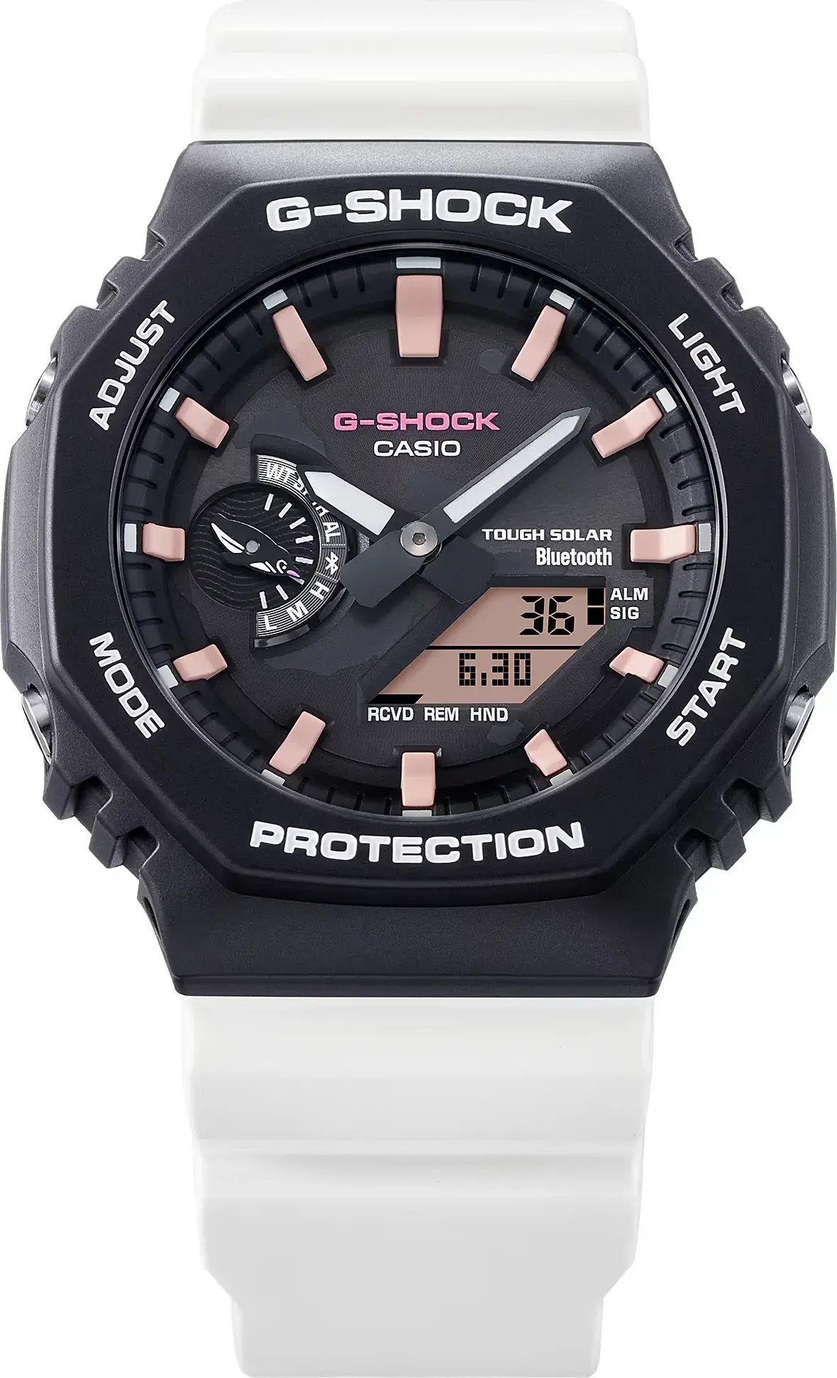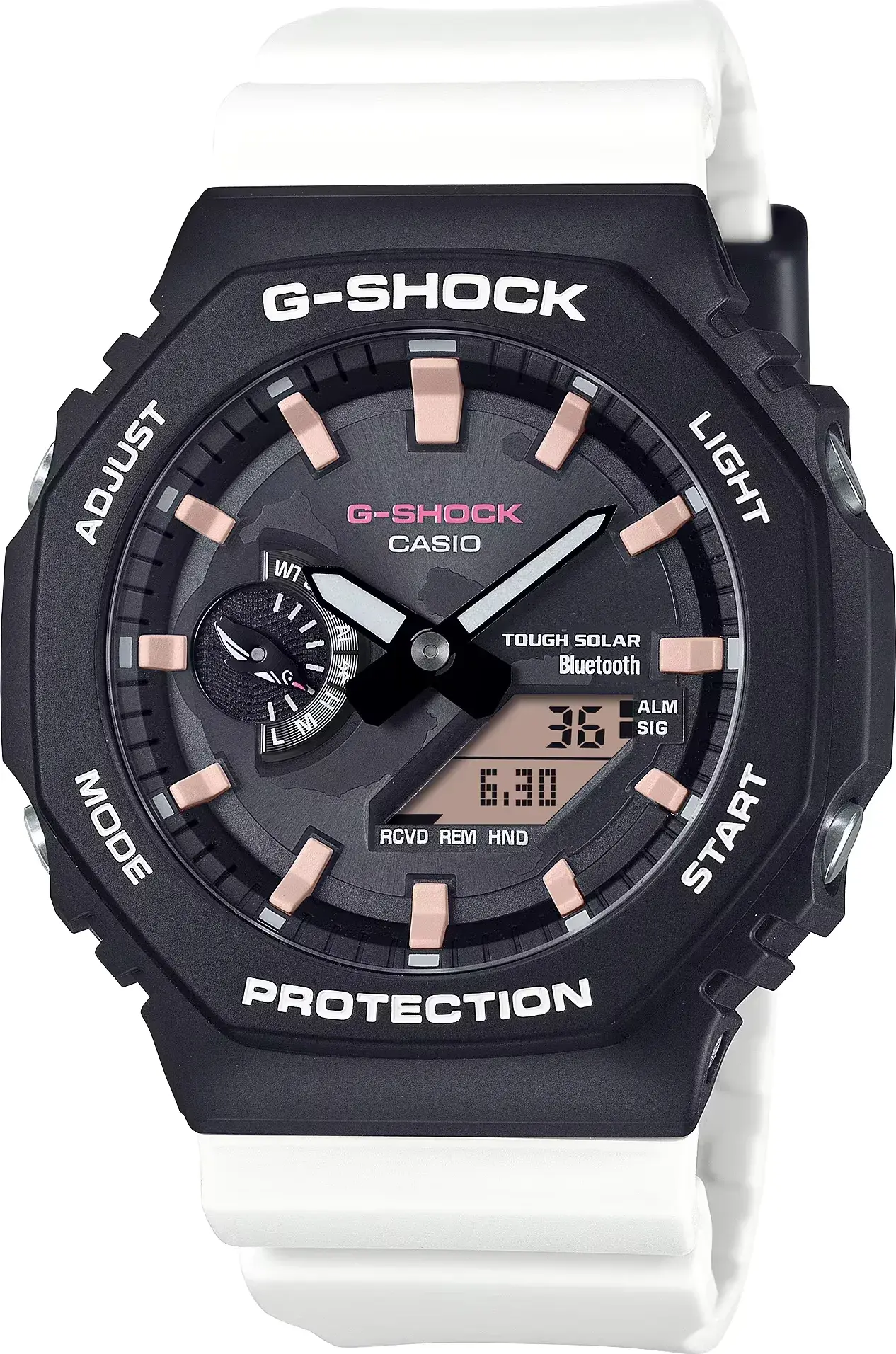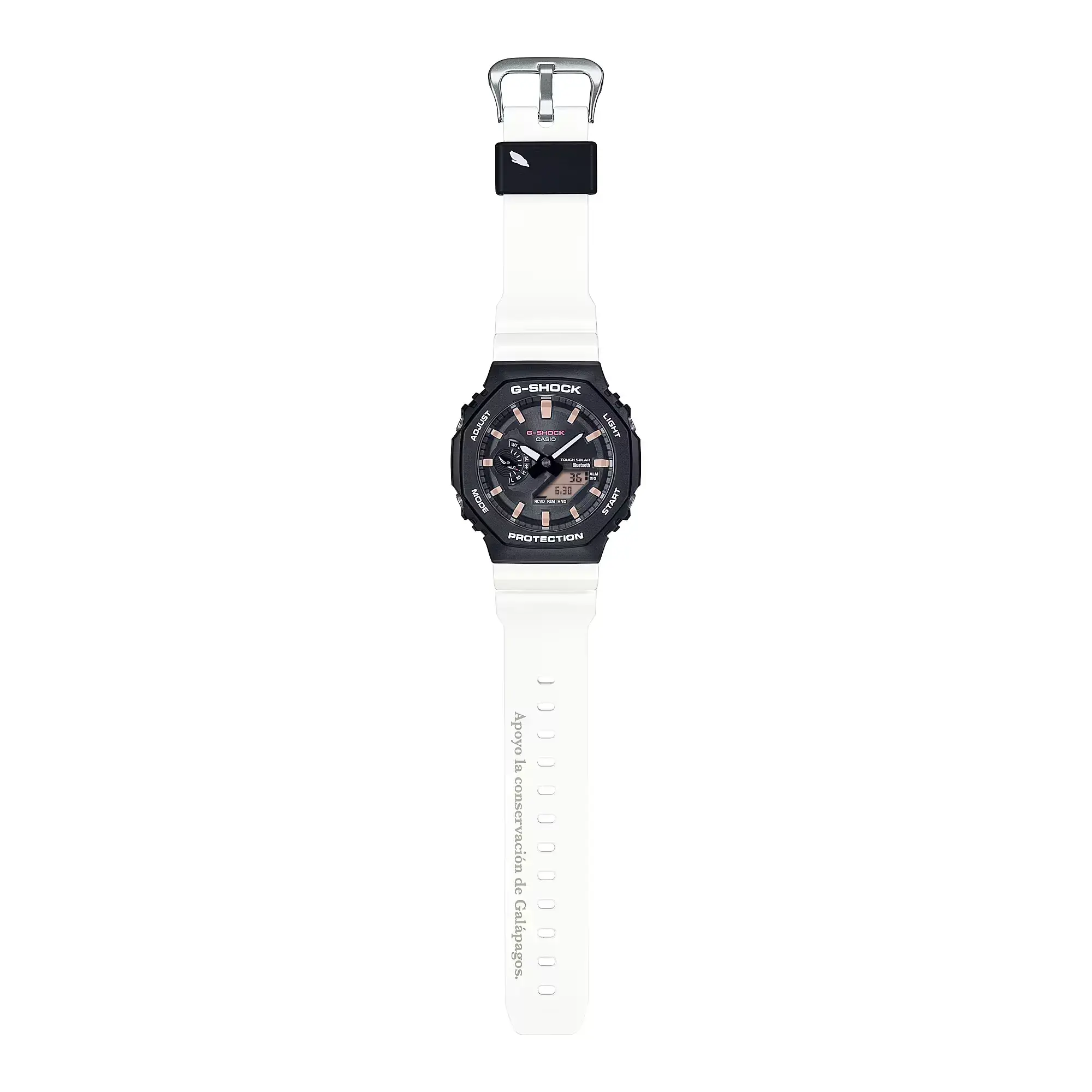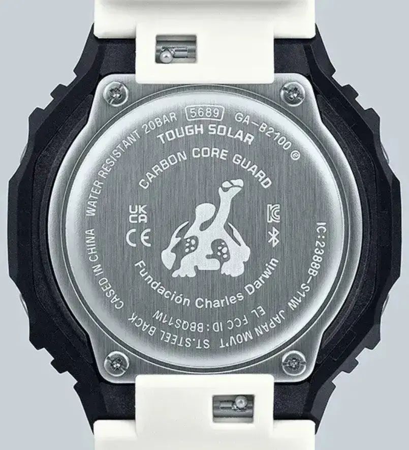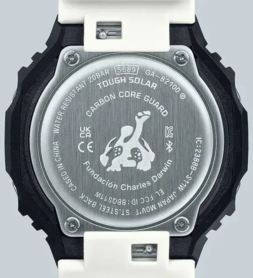 Мужские кварцевые аналого-цифровые часы на солнечной батарее. Серия G-Shock limited. Лимитированная модель (выпущена ограниченным тиражом), разработанная в сотрудничестве Casio с Фондом имени Чарльза Дарвина, организацией, которая занимается охраной окружающей среды на Галапагосских островах. Именно там в 1835 году Чарльзу Дарвину пришла идея о его теории эволюции. Данная модель часов посвящена Галапагосскому пингвину. Бело-чёрная гамма часов соответствует окраске галапагосского пингвина — уникальному виду пингвинов, обитающему на экваторе с годовой температурой +18—28°С. Противоударный пластиковый корпус с углеродными волокнами (структура Carbon Core Guard) защищает внутренний модуль часов от повреждений и деформаций при ударах и вибрации. Питание от солнечной энергии Tough Solar — источником питания служит светочувствительная панель и аккумулятор, который заряжается при попадании солнечных лучей на циферблат часов. Запас хода при полном заряде аккумулятора до 7 месяцев. Часы оснащены беспроводной технологией Bluetooth® со сверхнизким потреблением энергии для синхронизации со смартфоном. При подключении к смартфону часы автоматически корректируют текущее время и получают доступ к ряду полезных функций. Двойная светодиодная подсветка, послесвечение, настройка продолжительности подсветки 1,5 или 3 с. Секундомер с точностью измерения 1/100 секунды (в течение первого часа), 1 секунда (через 1 час) и временем измерения 24ч. Режимы измерения: прошедшее время, время прохождения части и круга дистанции. Таймер обратного отсчета от 1 секунды до 60 минут с интервалом в 1 секунду. 5 ежедневных будильников, ежечасный сигнал. Мировое время - 38 городов (38 часовых поясов), всемирное координированное время (UTC). Функция включения/отключения летнего времени. Переключение между домашним и мировым временем. 12-ти и 24-х часовой формат отображения времени. Автоматический календарь до 2099 г. Отображение дней недели на шести языках. Включение/выключение звука кнопок. Функция перемещения стрелок для удобного просмотра информации на цифровом дисплее. Индикатор заряда батареи. Стрелка индикатора режима часов у метки девяти часов выполнена в виде силуэта ныряющего пингвина. Функция сохранения энергии. Функция поиска телефона. Усиленный углеродными волокнами корпус из биопластика (изготавливается из возобновляемых органических ресурсов ) чёрного цвета. Размеры корпуса 48,5 мм на 45,4 мм, толщина 11,9 мм. Центральные часовая и минутная стрелки. Чёрный циферблат с часовыми метками в виде штрихов. Стрелки и метки с люминесцентным покрытием, которое светится в темноте после непродолжительного воздействия света. Минеральное стекло устойчивое к мелким механическим повреждениям. Белый ремешок из биопластика (изготавливается из возобновляемых органических ресурсов ) с классической застёжкой Buckle. На ремешке напечатана фраза «Apoyo la conservación de Galápagos» (по-испански «Я поддерживаю сохранение Галапагосских островов»). На петле ремешка нарисован силуэт ныряющего пингвина. На задней крышке выгравирован логотип Фонда Чарльза Дарвина (галапагосская слоновая черепаха). Водонепроницаемость 200WR (плавание и погружение без акваланга). Вес около 52 г. Часы поставляются в специальной экологичной упаковке без применения пластика, чтобы сохранить естественную среду обитания пингвинов.