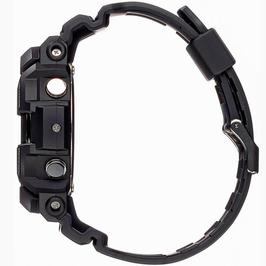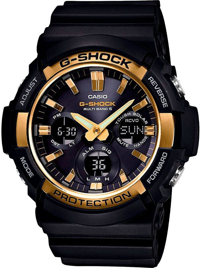 Мужские кварцевые аналого-цифровые наручные часы. Серия Casio G-Shock. Противоударный корпус защищает механизм часов от ударов и вибрации. Питание от солнечной энергии (технология Tough Solar) - источником питания служит светочувствительная панель и аккумулятор, заряжаемый при попадании солнечного света на циферблат часов. Индикатор низкого заряда батареи. Функция энергосбережения. Время работы без подзарядки в обычном режиме около 7 месяцев, в режиме энергосбережения около 18 месяцев. Двойная автоматическая светодиодная подсветка (поворот руки при недостаточном освещении обеспечит автоматическое включение подсветки циферблата) с возможностью выбора продолжительности освещения 1.5 или 3 секунды, послесвечение. Светонакопительное покрытие стрелок обеспечивает длительное послесвечение в темноте даже после кратковременного воздействия света. Коррекция текущего времени радиосигналом (Wave Ceptor) на территории почти всей Европы, США, Японии и Китая до 6 раз в день - технология Multi Band 6 позволяет принимать сигналы от шести радиовышек, расположенных в различных точках земного шара, передающих временные сигналы от определенных атомных часов. Секундомер с точностью показаний 1/100 секунды и временем измерения 1 ч. Режимы измерения: прошедшее время, промежуточное время, два финишных результата. Таймер обратного отсчета от 1 минуты до 100 минут (с интервалом в 1 секунду). Мировое время 31 часовая зона (48 городов), всемирное координированное время (UTC), включение/отключение летнего времени. 12/24-х часовой формат отображения времени. 5 ежедневных будильников, один с функцией повтора сигнала Snooze. ежечасный сигнал. Автоматический календарь до 2099 г. Функция включения/отключения звука кнопок (Mute). Функция перемещения стрелок для удобного просмотра информации на цифровых дисплеях. Круглый корпус размером 55,1 мм на 52,5 мм, толщиной 16,7 мм. Чёрный пластиковый ремешок с классической застёжкой buckle. Водонепроницаемость 200 WR (плавание и ныряние без акваланга). Вес около 72 г.