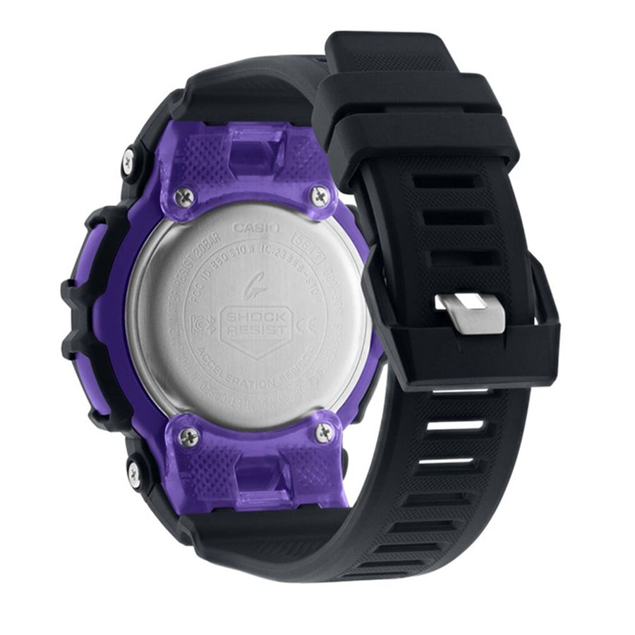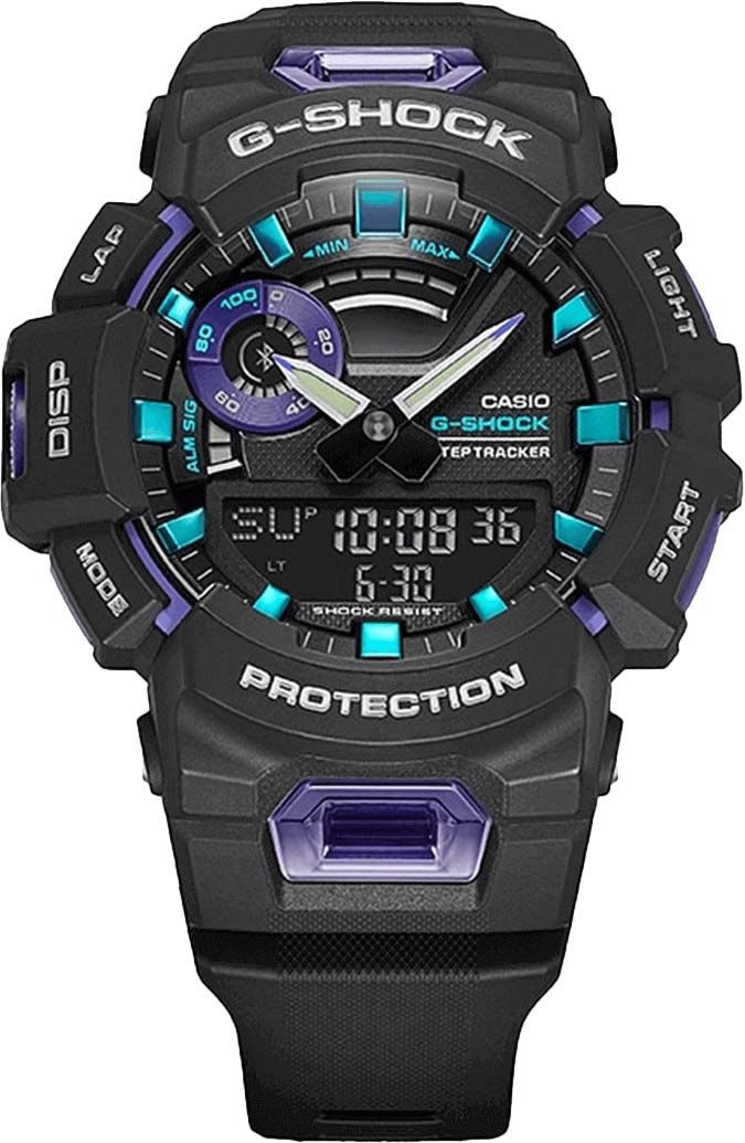 Мужские кварцевые аналого-цифровые наручные часы. Серия Casio G-Shock. Модель в черном корпусе с фиолетовыми и бирюзовыми деталями. Противоударный корпус защищает механизм часов от ударов и вибрации. Светодиодная автоматическая подсветка - при недостаточной освещенности поворот запястья включит подсветку часов. Настройка продолжительности подсветки 1,5 или 3 с. 12-ти и 24-х часовой формат отображения времени. Секундомер с точностью показаний 1/100 секунды (в течение первого часа), 1 секунда (через 1 час) и временем измерения 24 ч. Режимы измерения: прошедшее время, время прохождения круга и части дистанции, отображение на экране расстояния/темпа, автоматическое измерение времени прохождения круга/части дистанции, автоматическое оповещение о прохождении круга/части дистанции, сохранение в памяти до 45 результатов измерений. Таймер обратного отсчёта от 1 секунды до 60 минут с автоповтором, возможность установки до 5 таймеров. Количество повторений таймера от 1 до 20. Шагомер измеряет количество шагов от 0 до 999999 шагов. Звуковое напоминание об отсутствии активности и достижении цели. Функция расчета Lifelog - расчет калорий и расстояния на основе количества шагов. Мировое время. Одновременное отображение текущего времени в двух разных часовых поясах. 5 ежедневных будильников, ежечасный сигнал. Часы оснащены беспроводной технологией Bluetooth® со сверхнизким потреблением энергии для синхронизации со смартфоном. При подключении к смартфону часы автоматически корректируют текущее время, в том числе переход на зимнее/летнее время, копируют настройки мирового времени более чем для 300 городов и получают доступ к ряду функций. С помощью специального приложения G-Shock Move можно просматривать историю активности, журналы с подсчетом шагов и сожженными калориями. Функция перемещения стрелок для удобного просмотра информации на цифровом экране. Функция отключения/включения звука кнопок. Функция поиска телефона. Уведомление о входящих вызовах. Авиарежим позволяет отключить радио- и GPS-приемник на время перелета. Предупреждение о низком уровне заряда аккумуляторной батареи. Автоматический календарь до 2099 года. Круглый пластиковый корпус чёрного цвета. Размеры корпуса 48,9 мм на 51,3мм, толщина 16,6мм. Чёрный циферблат с часовыми метками в виде штрихов. Центральные часовая и минутная стрелки. Стрелки с люминесцентным покрытием, которое светится в темноте после непродолжительного воздействия света. Устойчивое к мелким механическим повреждениям минеральное стекло. Чёрный) пластиковый ремешок с классической застёжкой buckle. Батарея рассчитана на 2 года. Водонепроницаемость 200WR (плавание и погружение без акваланга). Вес около 61 г.