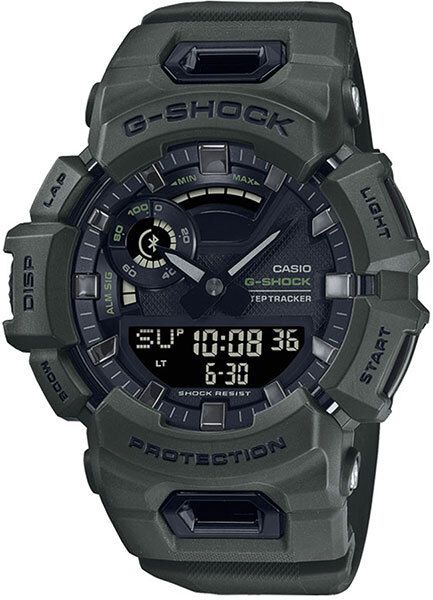 Мужские кварцевые аналого-цифровые наручные часы. Серия Casio G-Shock G-Squad. Противоударный корпус защищает механизм часов от ударов и вибрации. Светодиодная автоматическая подсветка - при недостаточной освещенности поворот запястья включит подсветку часов. Настройка продолжительности подсветки 1,5 или 3 с. 12-ти и 24-х часовой формат отображения времени. Секундомер с точностью показаний 1/100 секунды (в течение первого часа), 1 секунда (через 1 час) и временем измерения 24 ч. Режимы измерения: прошедшее время, время прохождения круга и части дистанции, отображение на экране расстояния/темпа, автоматическое измерение времени прохождения круга/части дистанции, автоматическое оповещение о прохождении круга/части дистанции, сохранение в памяти до 45 результатов измерений. Таймер обратного отсчёта от 1 секунды до 60 минут с автоповтором, возможность установки до 5 таймеров. Количество повторений таймера от 1 до 20. Шагомер измеряет количество шагов от 0 до 999999 шагов. Звуковое напоминание об отсутствии активности и достижении цели. Функция расчета Lifelog - расчет калорий и расстояния на основе количества шагов. Мировое время. Одновременное отображение текущего времени в двух разных часовых поясах. 5 ежедневных будильников, ежечасный сигнал. Часы оснащены беспроводной технологией Bluetooth® со сверхнизким потреблением энергии для синхронизации со смартфоном. При подключении к смартфону часы автоматически корректируют текущее время, в том числе переход на зимнее/летнее время, копируют настройки мирового времени более чем для 300 городов и получают доступ к ряду функций. С помощью специального приложения G-Shock Move можно просматривать историю активности, журналы с подсчетом шагов и сожженными калориями. Функция перемещения стрелок для удобного просмотра информации на цифровом экране. Функция отключения/включения звука кнопок. Функция поиска телефона. Уведомление о входящих вызовах. Авиарежим позволяет отключить радио- и GPS-приемник на время перелета. Предупреждение о низком уровне заряда аккумуляторной батареи. Автоматический календарь до 2099 года. Круглый пластиковый корпус зелёного (хаки) цвета. Размеры корпуса 48,9 мм на 51,3мм, толщина 16,6мм. Чёрный циферблат с часовыми метками в виде штрихов. Центральные часовая и минутная стрелки. Стрелки с люминесцентным покрытием, которое светится в темноте после непродолжительного воздействия света. Устойчивое к мелким механическим повреждениям минеральное стекло. Зелёный (хаки) пластиковый ремешок с классической застёжкой buckle. Батарея рассчитана на 2 года. Водонепроницаемость 200WR (плавание и погружение без акваланга). Вес около 61 г.