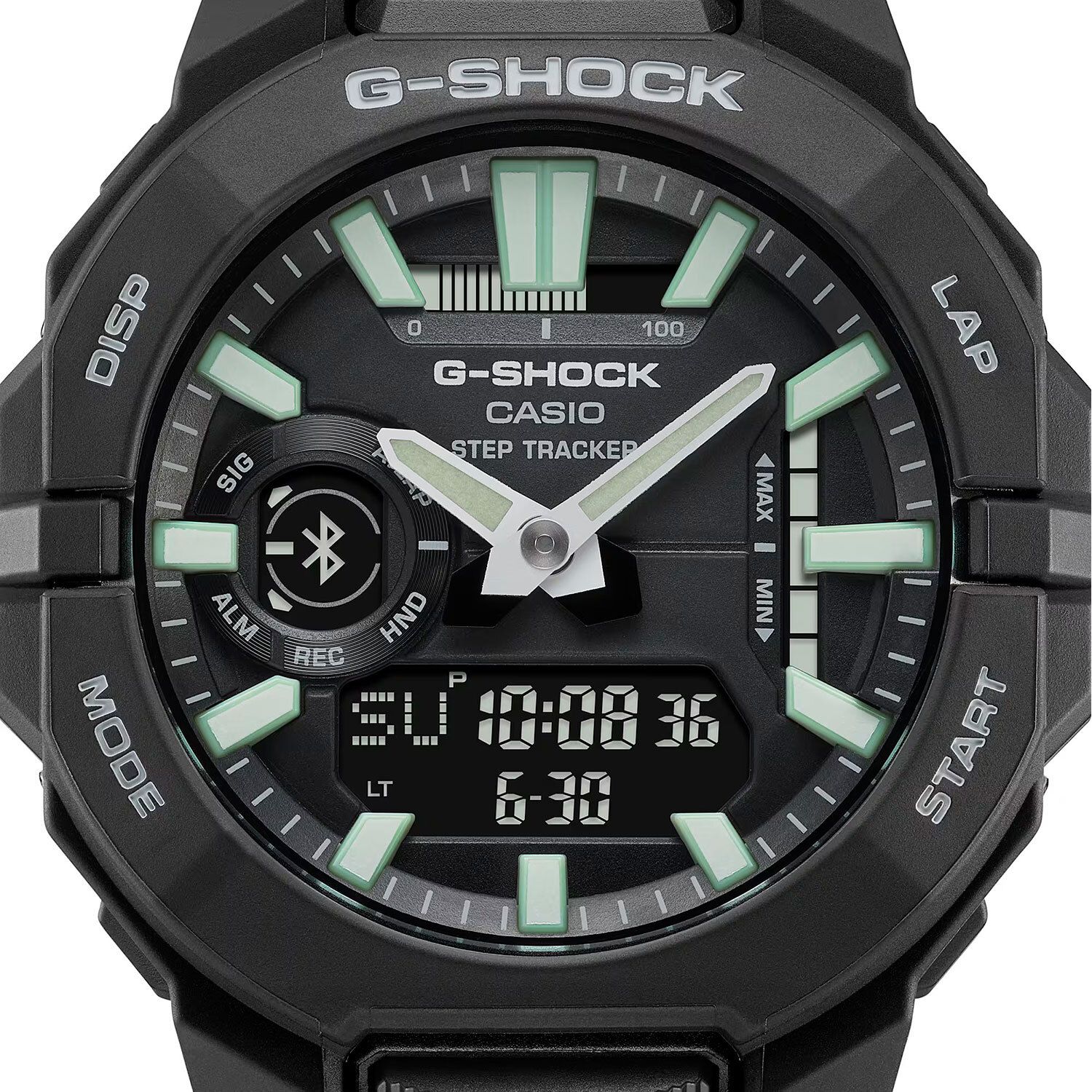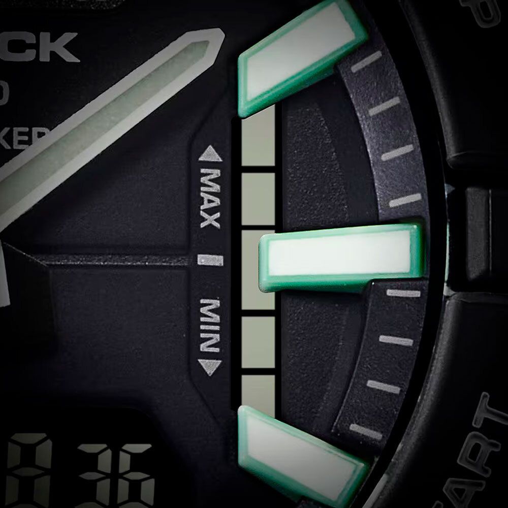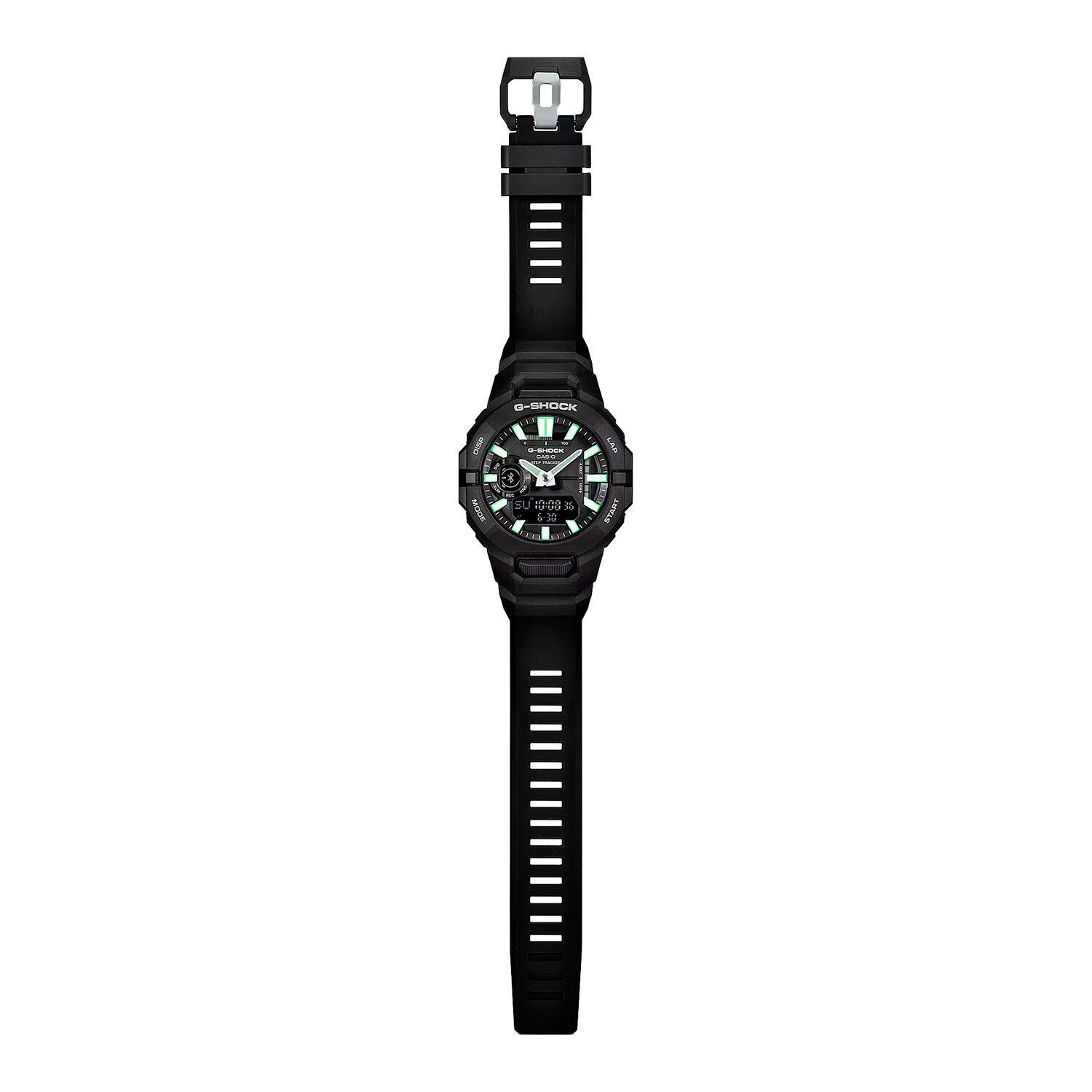 Мужские кварцевые аналого-цифровые наручные часы. Серия Casio G-Shock G-Squad. Спортивные часы для бегунов и любителей активного образа жизни. Цельная бесшовная конструкция безеля и ремешка обеспечивает плотную и удобную посадку часов на запястье. Противоударный корпус защищает механизм часов от ударов и вибрации. Двойная светодиодная подсветка (циферблата и ЖК-дисплея) с настраиваемой функцией послесвечения 1,5 или 3 секунды. 12-ти и 24-х часовой формат отображения времени. Секундомер с точностью показаний 1/100 секунды и временем измерения 24 ч. Режимы измерения: прошедшее время, время прохождения круга и части дистанции, память на 45 записей с данными о времени, дистанции, среднем темпе и сожженных калориях. Таймер обратного отсчёта от от 1 секунды до 24 часов с автоповтором, возможность установки до 5 таймеров. Количество повторений таймера от 1 до 20. Шагомер (в верхней части циферблата размещена шкала трекера шагов) автоматически начинает отсчет шагов при начинал движения. Точное количество шагов отображается на дисплее, а шкала у отметки 12 часов показывает прогресс достижения цели в процентах. Одновременное отображение текущего времени в двух разных часовых поясах. Мировое время – 300 городов. 5 ежедневных будильников, ежечасный сигнал. Часы оснащены беспроводной технологией Bluetooth® со сверхнизким потреблением энергии для синхронизации со смартфоном. При подключении к смартфону часы автоматически корректируют текущее время и получают доступ к ряду функций. Функция перемещения стрелок для удобного просмотра информации на цифровом экране. Функция отключения/включения звука кнопок. Функция поиска телефона. Предупреждение о низком уровне заряда аккумуляторной батареи. Автоматический календарь до 2099 года. Круглый корпус из биопластика (изготавливается из возобновляемых органических ресурсов) чёрного цвета. Размеры корпуса 48,5 мм на 43,9мм, толщина 16мм. Чёрный циферблат с часовыми метками в виде штрихов. Центральные часовая и минутная стрелки. Стрелки и метки с люминесцентным покрытием, которое светится в темноте после непродолжительного воздействия света. Устойчивое к мелким механическим повреждениям минеральное стекло. Ремешок чёрного цвета из биопластика (изготавливается из возобновляемых органических ресурсов) с классической застёжкой buckle. Батарея рассчитана на 2 года. Водонепроницаемость 200WR (плавание и погружение без акваланга). Вес около 53 г.