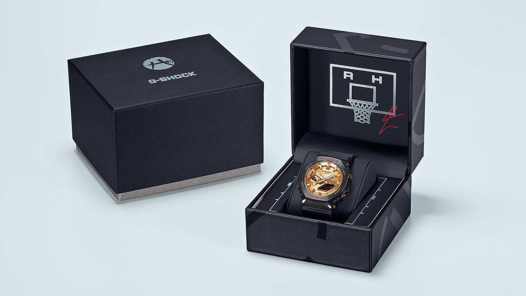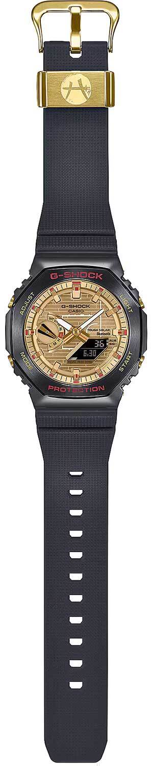 Мужские кварцевые аналого-цифровые наручные часы. Серия G-Shock x Rui Hachimura. Модель создана совместно с Руи Хатимурой (Rui Hachimura) — японским профессиональным баскетболистом, выступающим за команду «Лос-Анджелес Лейкерс» в Национальной баскетбольной ассоциации. Логотип Хатимуры «Черный самурай» выгравирован на стальной петле ремешка и кнопке в положении «8 часов». Логотип сочетает в себе символ 八 (hachi по-японски «восемь» - номер, под которым играет Руи Хатимура ) с японским мечом. Подпись Хатимуры выгравирована на задней крышке часов. Весь циферблат часов выполнен в мотиве баскетбольной площадки. Черно-красный цвет ЖК-дисплея вдохновлен 24-секундным таймером для броска в игре. Противоударный корпус защищает механизм часов от ударов и вибрации. Питание от солнечной энергии Tough Solar - источником питания служит светочувствительная панель и аккумулятор, заряжаемый при попадании солнечного света на циферблат часов. Индикатор уровня заряда батареи. Функция автоматического сохранения энергии. Время работы аккумулятора без подзарядки около 7 месяцев, при включенной функции сохранения энергии около 18 месяцев. Двойная светодиодная подсветка обеспечивает подсветку не только аналогового циферблата, но и цифрового дисплея. Настраиваемое послесвечение 1,5 с или 3 с. Необритовое светонакопительное покрытие стрелок обеспечивает длительное послесвечение в темноте даже после кратковременного воздействия света. 12-ти и 24-х часовой формат отображения времени. Секундомер с точностью измерения 1/100 секунды (в течение первого часа) и 1 секунда (через 1 час) и временем измерения 24ч. Режимы измерения: прошедшее время, время прохождения части и круга дистанции. Таймер обратного отсчета от 1с до 1часа. Мировое время – 38 городов (38 часовых поясов), всемирное координированное время (UTC). Функция включения/отключения летнего времени, переключение между домашним и мировым временем. Часы оснащены беспроводной технологией Bluetooth® со сверхнизким потреблением энергии для синхронизации со смартфоном. При подключении к смартфону часы автоматически корректируют текущее время , в том числе переход на зимнее/летнее время, копируют настройки мирового времени более чем для 300 городов и получают доступ к ряду полезных функций. Функция поиска телефона. Функция отключения/включения звука кнопок. Функция перемещения стрелок для удобного просмотра информации на цифровом дисплее. 5 ежедневных будильников, почасовой сигнал времени. Автоматический календарь до 2099 г. Золотистый циферблат с часовыми метками в виде штрихов украшен узором в виде баскетбольной площадки. Устойчивое к мелким механическим повреждениям минеральное стекло. Восьмиугольный корпус со стальным безелем с покрытием чёрного цвета. Размеры корпуса 49,3 мм на 44,4 мм , толщина 11,9 мм. Стальная задняя крышка. Чёрный ремешок из биопластика (изготавливается из возобновляемых органических ресурсов) с классической застежкой buckle. Водонепроницаемость 200 WR (плавание и ныряние без акваланга). Вес около 78 г. Часы поставляются в специальной упаковке.