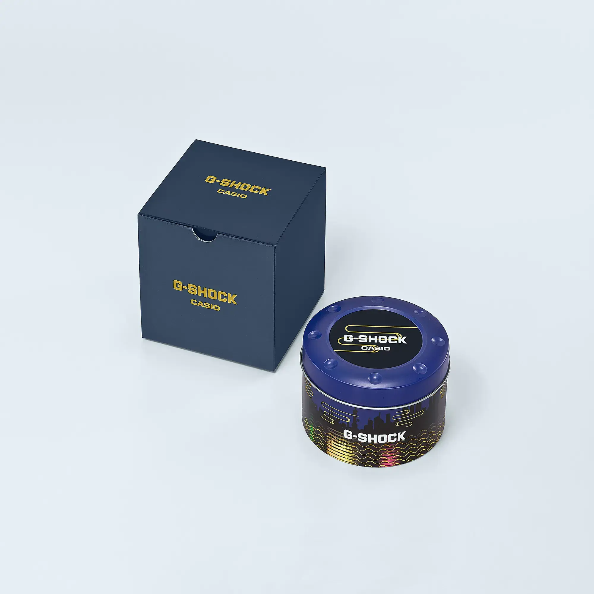 Мужские кварцевые аналогово-цифровые наручные часы. Ограниченная серия G-Shock. Цветовое решение дизайна часов вдохновлено неоновым свечением ночных горизонтов. Ударопрочная конструкция корпуса защищает механизм часов от ударов и вибрации. Часы защищены от воздействия магнитных полей. Циферблат подсвечивается светодиодом, при недостаточном освещении поворт руки обеспечит автоматическое включение подсветки дисплея. Настраиваемое послесвечение 1,5 или 3 с. Необритовое светонакопительное покрытие обеспечивает длительное послесвечение в темноте даже после кратковременного воздействия света. 12-ти и 24-х часовой формат отображения времени. Секундомер с точностью показаний 1/100с и временем измерения 1000 ч. Режимы измерения: прошедшее время, промежуточное время, два финишных результата. Таймер обратного отсчета от 1мин до 24 ч (с интервалом в 1 минуту и с интервалом в 1 час). Мировое время – 48 городов (31 часовой пояс), всемирное координированное время (UTC). Функция включения/отключения летнего времени. Переключение между домашним и мировым временем. Функция отключения/включения звука кнопок. Автоматический календарь до 2099 г. 5 ежедневных будильников, один с функцией Snooze (повтор сигнала), ежечасный сигнал. Устойчивое к мелким механическим повреждениям минеральное стекло. Корпус из полимерного пластика, поверх которого расположена литая стальная часть синего цвета. Размеры корпуса 48,8 мм на 51,9мм, толщина 16,9мм. Чёрный пластиковый ремешок с классической застёжкой. Батарейка рассчитана на 3 года. Водозащита 200WR (плавание и ныряние без акваланга). Вес около 93 г.