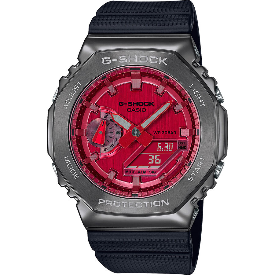 Мужские кварцевые аналого-цифровые наручные часы. Серия G-Shock. Противоударный корпус защищает механизм часов от ударов и вибрации. Двойная светодиодная подсветка обеспечивает подсветку не только аналогового циферблата, но и цифрового дисплея. Настраиваемое послесвечение 1,5 или 3с. Необритовое светонакопительное покрытие стрелок обеспечивает длительное послесвечение в темноте даже после кратковременного воздействия света. 12-ти и 24-х часовой формат отображения времени. Секундомер с точностью показаний 1/100с (до 1ч) и 1с (после 1ч) и временем измерения 24 ч. Режимы измерения: прошедшее время, промежуточное время, два финишных результата. Таймер обратного отсчета от 1с до 24 ч. Мировое время – 48 городов (31 часовой пояс), всемирное координированное время (UTC), функция включения/отключения летнего времени, переключение между домашним и мировым временем. Функция отключения/включения звука кнопок. 5 ежедневных будильников, один с функцией повтора сигнала Snooze, ежечасный сигнал. Функция перемещения стрелок для удобного просмотра информации на цифровом экране. Автоматический календарь до 2099 года. Красный циферблат с часовыми метками в виде штрихов. Ретроградный стрелочный указатель дня недели. Корпус из нержавеющей стали с IP покрытием серого цвета и полимерного пластика. Размер корпуса 44,4 мм на 49,3 мм, толщина 11,8 мм. Чёрный пластиковый ремешок с классической застёжкой buckle. Батарея рассчитана на 3 года. Водонепроницаемость 200WR (плавание и погружение без акваланга). Вес около 72 г.