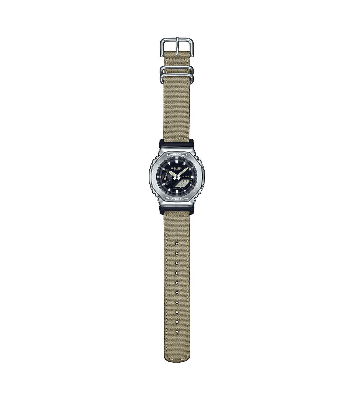 Мужские кварцевые аналого-цифровые наручные часы. Серия G-Shock. Противоударный корпус защищает механизм часов от ударов и вибрации. Двойная светодиодная подсветка обеспечивает подсветку не только аналогового циферблата, но и цифрового дисплея. Настраиваемое послесвечение 1,5 или 3с. Необритовое светонакопительное покрытие стрелок обеспечивает длительное послесвечение в темноте даже после кратковременного воздействия света. 12-ти и 24-х часовой формат отображения времени. Секундомер с точностью показаний 1/100с (до 1ч) и 1с (после 1ч) и временем измерения 24 ч. Режимы измерения: прошедшее время, промежуточное время, два финишных результата. Таймер обратного отсчета от 1с до 24 ч. Мировое время – 48 городов (31 часовой пояс), всемирное координированное время (UTC), функция включения/отключения летнего времени, переключение между домашним и мировым временем. Функция отключения/включения звука кнопок. 5 ежедневных будильников, один с функцией повтора сигнала Snooze, ежечасный сигнал. Функция перемещения стрелок для удобного просмотра информации на цифровом экране. Автоматический календарь до 2099 года. Чёрный циферблат с часовыми метками в виде штрихов. Ретроградный стрелочный указатель дня недели. Корпус из нержавеющей стали и полимерного пластика. Размер корпуса 44,4 мм на 49,3 мм, толщина 11,8 мм. Бежевый тканевый ремешок с классической застёжкой buckle. Батарея рассчитана на 3 года. Водонепроницаемость 200WR (плавание и погружение без акваланга). Вес около 72 г.
