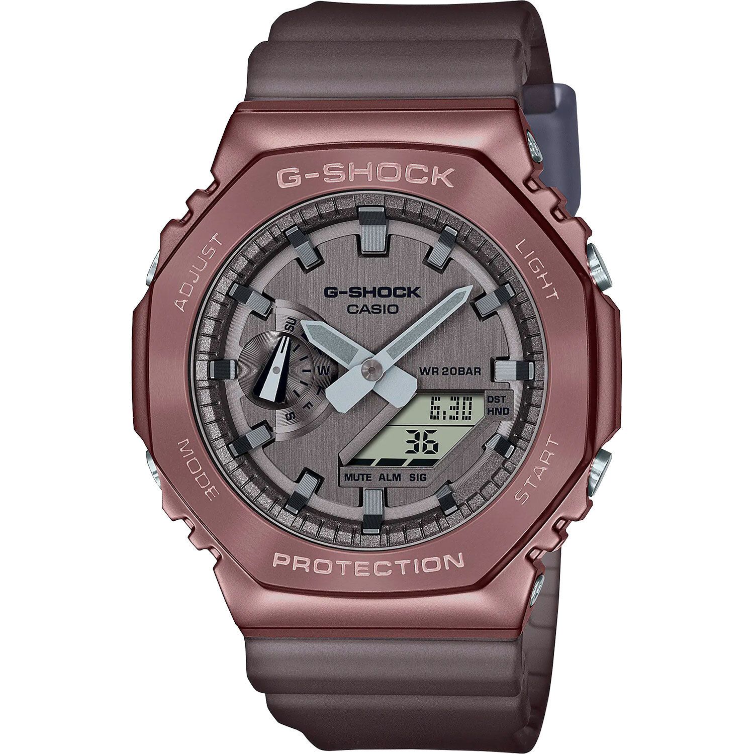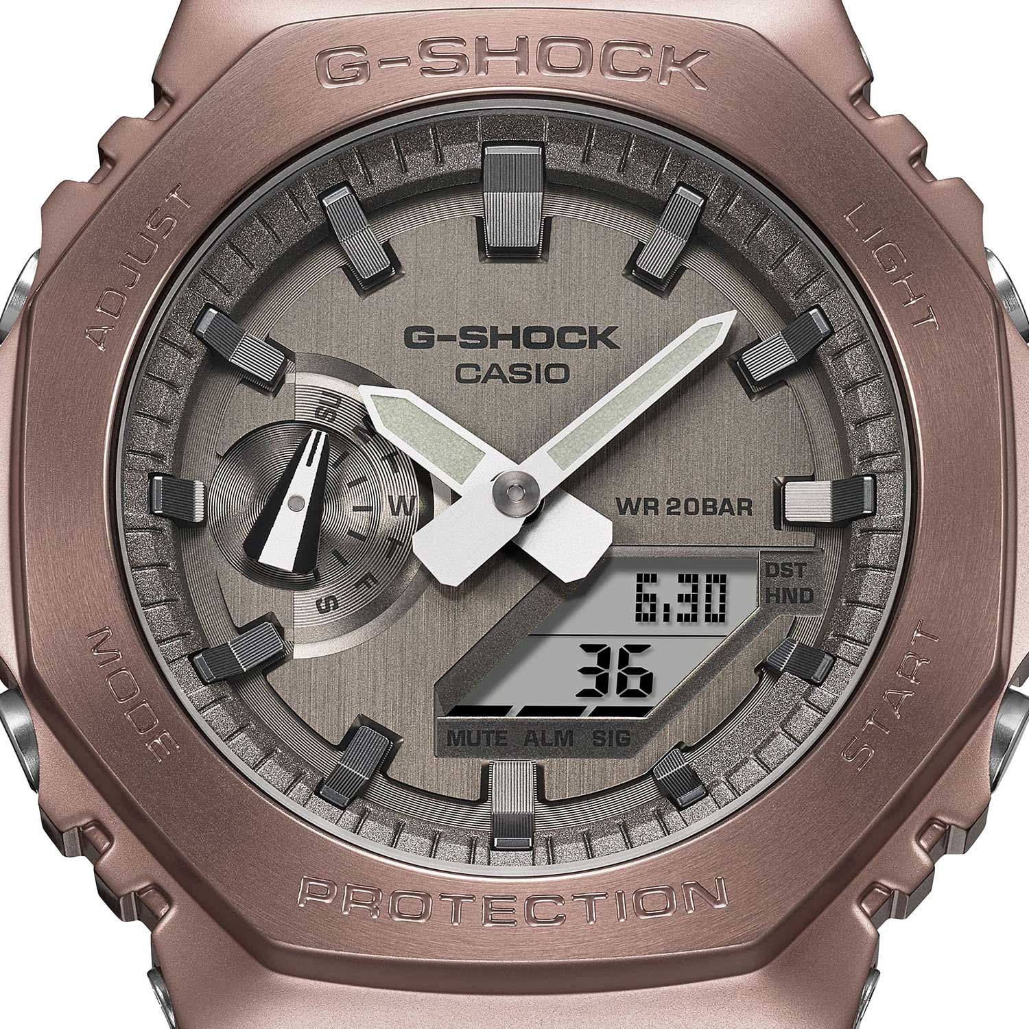 Мужские кварцевые аналого-цифровые наручные часы. Серия G-Shock. Противоударный корпус защищает механизм часов от ударов и вибрации. Двойная светодиодная подсветка обеспечивает подсветку не только аналогового циферблата, но и цифрового дисплея. Настраиваемое послесвечение 1,5 или 3с. Необритовое светонакопительное покрытие стрелок обеспечивает длительное послесвечение в темноте даже после кратковременного воздействия света. 12-ти и 24-х часовой формат отображения времени. Секундомер с точностью показаний 1/100с (до 1ч) и 1с (после 1ч) и временем измерения 24 ч. Режимы измерения: прошедшее время, промежуточное время, два финишных результата. Таймер обратного отсчета от 1с до 24 ч. Мировое время – 48 городов (31 часовой пояс), всемирное координированное время (UTC), функция включения/отключения летнего времени, переключение между домашним и мировым временем. Функция отключения/включения звука кнопок. 5 ежедневных будильников, один с функцией повтора сигнала Snooze, ежечасный сигнал. Функция перемещения стрелок для удобного просмотра информации на цифровом экране. Автоматический календарь до 2099 года. Серый циферблат с часовыми метками в виде штрихов. Ретроградный стрелочный указатель дня недели. Корпус из нержавеющей стали с IP покрытием бронзового цвета и полимерного пластика. Размер корпуса 44,4 мм на 49,3 мм, толщина 11,8 мм. Коричневый полупрозрачный пластиковый ремешок с классической застёжкой buckle. Батарея рассчитана на 3 года. Водонепроницаемость 200WR (плавание и погружение без акваланга). Вес около 72 г.