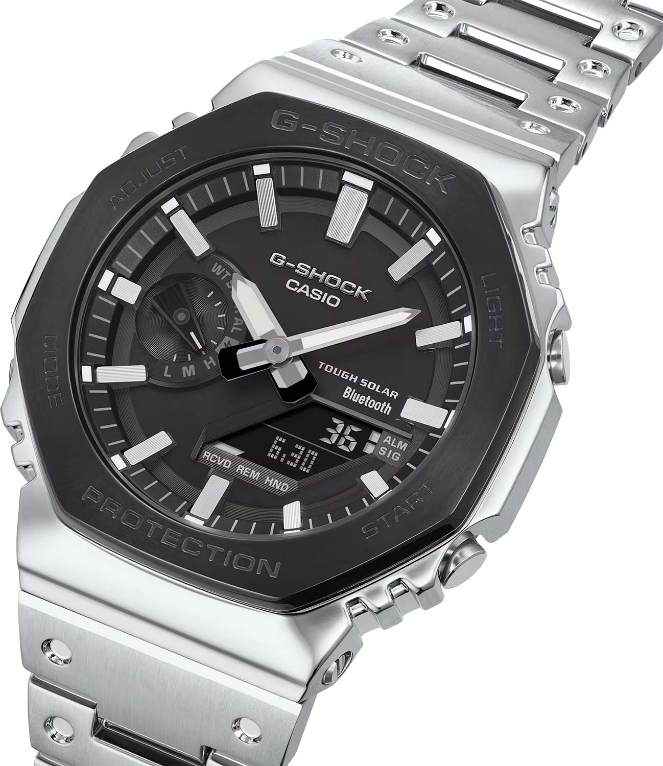 Мужские кварцевые наручные часы с аналогово-цифровым отображением времени. Серия G-Shock. Данная модель собирается только в Японии на производстве Casio в Ямагата. Противоударный корпус защищает механизм часов от ударов и вибрации. Модуль часов снабжен элементами из материала alphaGEL, который еще лучше защищает часы от сотрясения и вибрации. АlphaGEL представляет собой гибкую силиконовую прослойку, оказывающую амортизирующий эффект. Питание от солнечной энергии (технология Tough Solar) - источником питания служит светочувствительная панель и аккумулятор, заряжаемый при попадании солнечного света на циферблат часов. Индикатор уровня заряда батареи. Функция автоматического сохранения энергии. Время работы аккумулятора без подзарядки около 7 месяцев, при включенной функции сохранения энергии около 18 месяцев. Двойная светодиодная подсветка обеспечивает подсветку не только аналогового циферблата, но и цифрового дисплея. Настраиваемое послесвечение 1,5 или 3 секунды. Светонакопительное покрытие стрелок обеспечивает длительное послесвечение в темноте после кратковременного воздействия света. 12-ти и 24-х часовой формат отображения времени. Секундомер с двумя точностью показаний 1/100 секунды (в течение первого часа), 1 секунда (через 1 час) и временем измерения 24 часа. Режимы измерения: прошедшее время, время прохождения части и круга дистанции. Таймер обратного отсчета от 1 секунды до 1часа с шагом в 1 секунду. Сигнал оповещения об окончании обратного отсчета звучит в течение 10 секунд. Мировое время – 38 городов (38 часовых поясов), всемирное координированное время (UTC). Функция включения/отключения летнего времени. Переключение между домашним и мировым временем. Часы оснащены беспроводной технологией Bluetooth® со сверхнизким потреблением энергии для синхронизации со смартфоном. При подключении к смартфону часы автоматически корректируют текущее время, в том числе переход на зимнее/летнее время, копируют настройки мирового времени более чем для 300 городов и получают доступ к ряду полезных функций. Функция поиска телефона. Функция отключения/включения звука кнопок Функция перемещения стрелок для удобного просмотра информации на цифровом дисплее. 5 ежедневных будильников, почасовой сигнал времени. Автоматический календарь до 2099 г, отображение дней недели на шести языках. Чёрный циферблат с часовыми метками в виде штрихов. Устойчивое к мелким механическим повреждениям минеральное стекло. Восьмиугольный корпус из нержавеющей стали с чёрным IP покрытием на безеле. Размеры корпуса 59,8 мм на 44,4 мм, толщина 12,8 мм. Стальной браслет с тройной раскладывающейся застежкой. Задняя крышка с винтовым фиксатором. Водонепроницаемость 200 WR (часы подходят для плавания с маской, трубкой, обычного плавания). Вес около 165 г.