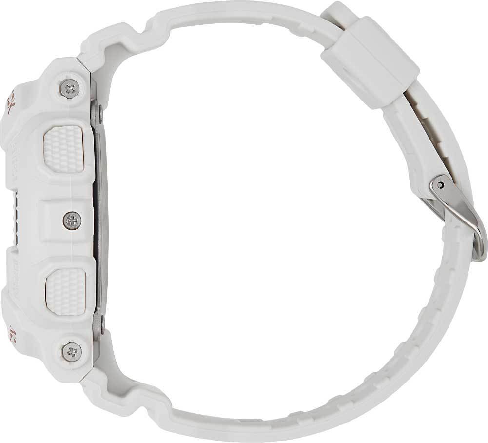Кварцевые наручные часы c аналого-цифровым отображением времени. Серия Casio G-Shock S-Series. Унисекс часы. Противоударный корпус защищает механизм часов от ударов и вибрации. Часы созданы с защитой от магнитных полей. Автоматическая светодиодная подсветка — при недостаточном освещении поворот руки включает подсветку циферблата, выбор продолжительности подсветки 1,5 или 3 секунды, послесвечение. Стрелки с люминесцентным покрытием, которое светится в темноте после непродолжительного воздействия света. Мировое время – 48 городов (29 часовых поясов), всемирное координированное время (UTC), включение/отключение летнего времени, переключение между домашним и мировым временем. 12-ти и 24-х часовой формат отображения времени. Секундомер с точностью показаний 1/1000 с и временем измерения 100 ч. Режимы измерения: пройденное время, время круга, промежуточное время. Расчет скорости по выбранной дистанции. Таймер обратного отсчета от 1 мин до 24 ч с автоповтором. 5 ежедневных будильников, один с функцией повтора сигнала Snooze, ежечасный сигнал. Автоматический календарь до 2099 года. Круглый корпус из полимерного пластика белого цвета. Размер корпуса 45,9 мм на 49мм, толщина 15,8мм. Устойчивое к мелким механическим повреждениям минеральное стекло. Белый пластиковый ремешок с классической застежкой buckle. Приблизительный срок службы батареи 3 года. Водонепроницаемость 200 WR (плавание и погружение без акваланга). Вес около 56г.