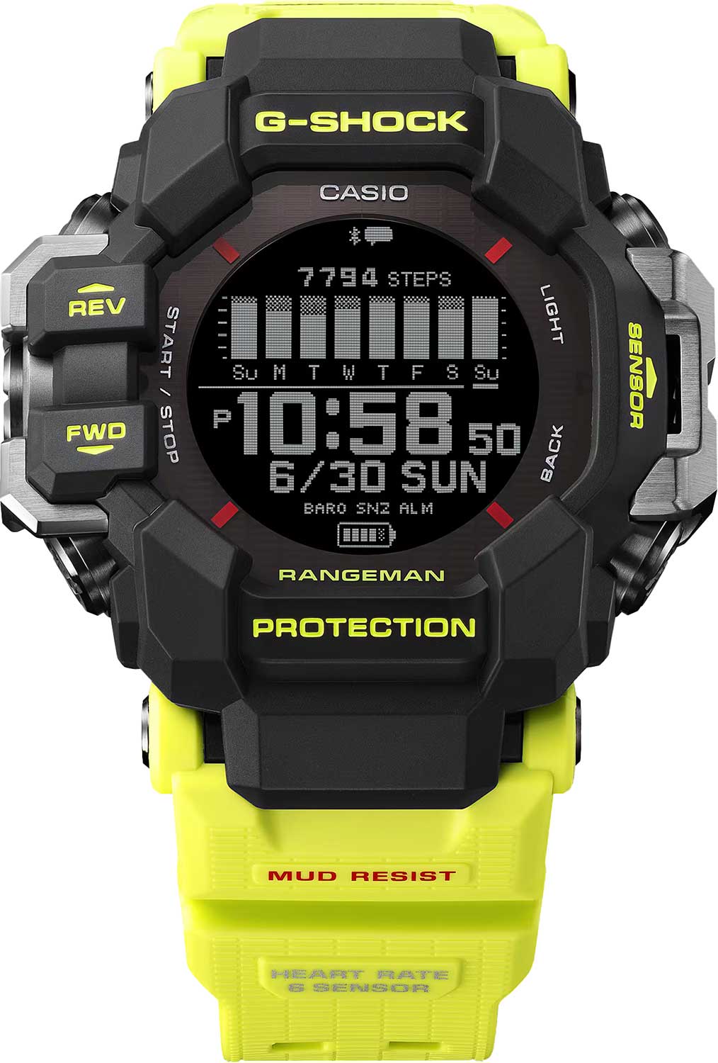 Мужские кварцевые электронные часы на солнечной батарее. Серия Rangeman Of G-Mudmaster. Часы оснащены 6-ю датчиками (датчик сердечного ритма, акселерометр, гироскоп, магнитный датчик, датчик давления и термодатчик) и датчиком GPS для отслеживания движения в режиме реального времени. Противоударный корпус защищает механизм часов от ударов и вибрации. Защита от попадания внутрь пыли и грязи. Питание от солнечной энергии (технология Tough Solar) — источником питания служит светочувствительная панель и аккумулятор, заряжаемый при попадании солнечного света на циферблат часов; индикатор уровня заряда батареи. Возможность зарядки через специальный кабель с разъемом USB типа A. Функция автоматического сохранения энергии. Время работы аккумулятора без подзарядки от 14 до 16часов (непрерывное использование GPS, датчика частоты сердечных сокращений); до 19часов (кратковременное использование GPS, датчика частоты сердечных сокращений); до 2 месяцев (с выключенным измерением частоты пульса); при включенной функции сохранения энергии до 23 месяцев. Светодиодная автоматическая подсветка с выбираемой длительностью свечения 1,5 или 3 секунды. Цвет подсветки белый. 12-ти и 24-х часовой формат отображения времени. Секундомер с точностью показаний 1секунда и временем измерения 100 часов. Режимы измерения: прошедшее время, промежуточное время. Таймер обратного отсчета от 1секунды до 1часа с автоповтором. 4 ежедневных будильника, один с функцией повтора сигнала Snooze, почасовой сигнал времени. Умный будильник (с повтором). Автоматический календарь до 2099 года. Включение/выключение звука кнопок и виброоповещения. Мировое время – 38 городов (38 часовых поясов), всемирное координированное время (UTC). Автоматический переход на зимнее и летнее время, возможность включения/отключения данной функции. Отображение возраста и фазы Луны. Время восхода и захода Солнца на конкретную дату. График приливов и отливов. Технология Smart Access. Мультиспорт (бег, трекинг, ходьба, езда на велосипеде, плавание и др.). Анализ тренировки: статус кардионагрузки. Данные журнала активности: до 100 пробежек по 200 кругов каждая, время измерения, расстояние, темп, индекс бега, сожженные калории, использованный источник энергии, частота пульса, кардионагрузка, шаг, количество ударов. Измерение частоты сердечного пульса (max 220 ударов в минуту), частота сердечных сокращений, графическая индикация зоны сердечного ритма, график сердечного ритма. Функция измерения уровня кислорода в крови. Измерение сна. Шагомер измеряет количество шагов от 0 до 999999 шагов. Устойчивость к низким температурам (-20 °C). Встроенный GPS датчик определяет точное время и местоположение. Барометр - измерение атмосферного давления от 260 до 1100 гПа (от 195 до 825 мм рт. Термометр от -10° до +60°С (от 14 до 140 °F) с точностью 0,1°C. Встроенный цифровой компас (диапазон измерения от 0° до 359° с точностью 1°). Высотомер (альтиметр) - диапазон измерения –700 – 10 000 м (–2300–32800 футов); диапазон отображения –10 000 – 10 000 м (–32 800 – 32 800 футов); единица измерения 1 м (или 5 футов). Интервал измерения - каждую секунду в течение первых 3 минут, затем каждые 5 секунд в течение 1 часа или каждые 2 минуты в течение 12 часов. 10 000 м. График набора высоты. Функция уведомлений (входящие звонки, входящие электронные письма, новые публикации в социальных сетях, уведомления календаря, напоминания). Функция