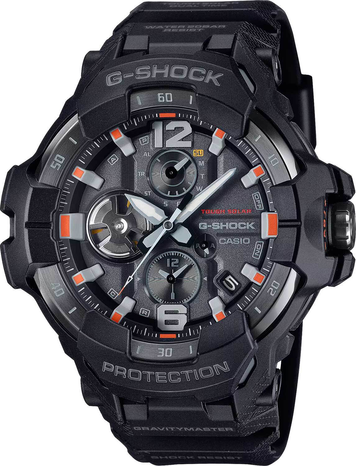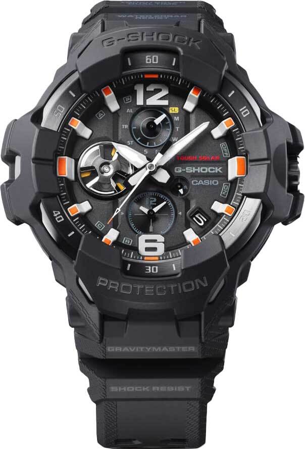 Мужские кварцевые аналоговые часы на солнечной батарее. Серия G-Shock Master of G Gravitymaster. Дизайн часов вдохновлен приборной панелью самолета. Часы предназначены для работы в самых сложных условиях. Противоударный пластиковый корпус с углеродными волокнами (структура Carbon Core Guard) более прочный и, в то же время, более легкий, защищает внутренний модуль часов от повреждений и деформаций при ударах и вибрации, обеспечивает жесткость и коррозионную стойкость. Питание от солнечной энергии (технология Tough Solar) - источником питания служит светочувствительная панель и аккумулятор, подзаряжаемый при попадании солнечного света на циферблат часов. Запас хода при полном заряде аккумулятора до 5 месяцев, при включенной функции сохранения энергии до 18 месяцев. Часы оснащены беспроводной технологией Bluetooth® со сверхнизким потреблением энергии для синхронизации со смартфоном. При подключении к смартфону часы автоматически корректируют текущее время и получают доступ к ряду полезных функций. Светодиодная подсветка (Super Illuminator) с функцией послесвечения. Секундомер с точностью измерения до секунды и временем измерения 24ч.