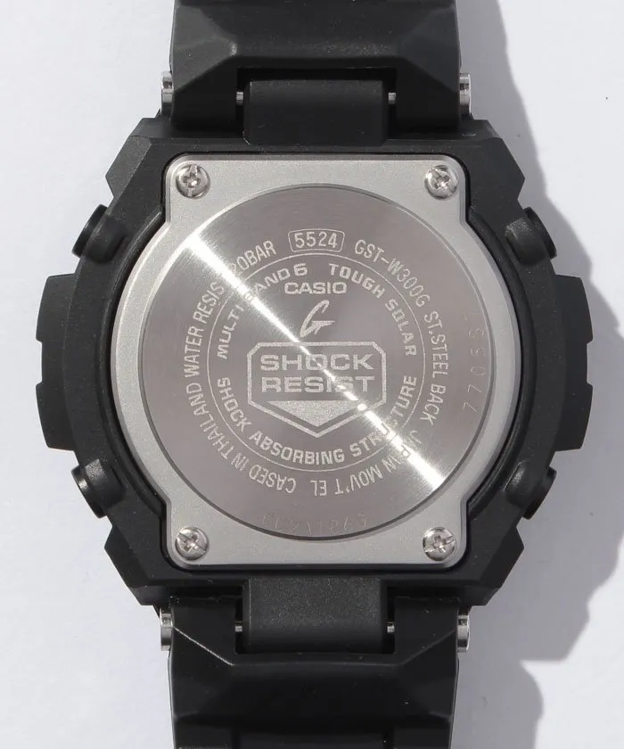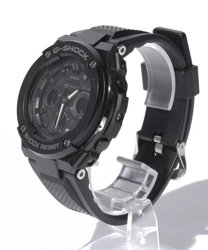 Мужские кварцевые наручные часы с аналого-цифровым отображением времени. Серия Casio G-Shock G-Steel. Противоударный корпус защищает механизм часов от ударов и вибрации. Питание от солнечной энергии (технология Tough Solar) - источником питания служит светочувствительная панель и аккумулятор, заряжаемый при попадании солнечного света на циферблат часов. Индикатор низкого заряда батареи. Функция энергосбережения. Время работы без подзарядки в обычном режиме около 8 месяцев, в режиме энергосбережения приблизительно 19 месяцев. Двойная автоматическая светодиодная подсветка с возможностью выбора продолжительности освещения 1.5 или 3 секунды - одновременно подсвечивается аналоговый циферблат и цифровой дисплей. При недостаточном освещении поворот руки обеспечит автоматическое включение подсветки. Светонакопительное необритовое покрытие стрелок обеспечивает длительное послесвечение в темноте после кратковременного воздействия света. Технология Multi Band 6 позволяет принимать сигналы от шести радиовышек, расположенных в различных точках земного шара, которые передают временные сигналы от определенных атомных часов. Коррекция текущего времени радиосигналом на территории почти всей Европы, США, Японии и Китая. Таймер обратного отсчета от 1 минуты до 100 минут. Мировое время - 31 часовая зона (48 городов), всемирное координированное время (UTC). Функция включения/отключения летнего времени. 12/24-х часовой формат отображения времени. Секундомер с точностью показаний 1/100 секунды и временем измерения 1 час. Режимы измерения: прошедшее время, промежуточное время, два финишных результата. 5 ежедневных будильников, один с функцией повтора сигнала Snooze, ежечасный сигнал. Автоматический календарь до 2099 года. Функция включения/отключения звука кнопок. Функция перемещения стрелок для удобного просмотра информации на цифровом экране. Круглый двухслойный корпус чёрного цвета - между слоями стали, в качестве амортизирующей прокладки, выступает полимерный пластик. Размеры корпуса 49,3 мм на 55,9 мм, толщина 15,3 мм. Устойчивое к мелким механическим повреждениям минеральное стекло. Чёрный пластиковый ремешок с классической застёжкой buckle. Водонепроницаемость 200WR (плавание и погружение без акваланга). Вес около 84 г.