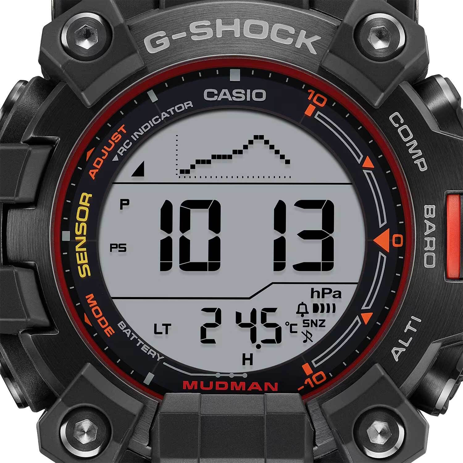 Мужские кварцевые электронные часы на солнечной батарее. Серия Casio G-Shock Master Of G -Mudman. Часы спроектированы и разработаны специально для работы в суровых условиях. Яркие красные, оранжевые и желтые акценты на циферблате часов символизируют экстренные цвета, используемые спасательными командами и другими профессионалами, участвующими в спасательных операциях. Ударопрочная конструкция защищает механизм часов от ударов и вибрации. Особая конструкция, устойчивая к пыли и загрязнениям, предохраняет от попадание грязи в часы. Полностью автоматическая светодиодная подсветка - поворот руки при недостаточном освещении обеспечит автоматическое включение подсветки дисплея. Питание от солнечной энергии (технология Tough Solar) - источником питания служит светочувствительная панель и аккумулятор, подзаряжаемый при попадании солнечного света на дисплей часов. Функция автоматического сохранения энергии ( в темноте дисплей гаснет для экономии энергии). Индикатор уровня заряда аккумулятора. Срок работы аккумулятора с полным зарядом около 6-ти месяцев, и около 26 месяцев при хранении в полной темноте с включенной функцией энергосбережения. Прием радиосигнала калибровки времени (Европа, США, Япония, Китай). Барометр- специальный датчик измеряет давление воздуха и отображает измеренное значение на экране в виде символа ( от 260 до 1100 гПа). Термометр- датчик измеряет температуру окружающего воздуха вокруг часов и отображает ее на экране в градусах °C (от –10,0°C до 60,0°C). Цифровой компас - диапазон измерения от 0° до 359°, непрерывное измерение в течение 1 минуты; калибровка (двунаправленная); коррекция угла магнитного склонения; 4 индикатора направлений (север, юг, запад, восток); указатель направления. Высотомер (альтиметр) - встроенный датчик барометрического давления с возможностью вывода результатов в единицах высоты над уровнем моря (от -700 до 10000 метров). Память данных высотомера до 30 записей. График набора высоты. Данные о восходе/закате солнца. Мировое время - 48 городов (31 часовой пояс), всемирное координированное время (UTC). Функция включения/отключения летнего времени. Секундомер с точностью показаний 1/10 секунды и временем измерения 1000 часов. Режимы измерения: прошедшее время, промежуточное время, два финишных результата. Таймер обратного отсчета времени от 1мин до 24 ч. 12-ти и 24-х часовой формат отображения времени. Автоматический календарь до 2099г. 5 ежедневных будильников, один с функцией Snooze (повтор сигнала), ежечасный сигнал. Функция отключения/включения звука кнопок. Часы устойчивы к низким температурам (-10 °C). Корпус из биопластика (изготавливается из возобновляемых органических ресурсов) чёрного цвета. Размер корпуса 56,7 мм на 52,7 мм, толщина 14,8 мм. На задней крышке выгравирован легендарный персонаж-крот MUDMAN, держащий компас. Чёрный ремешок из биопластика (изготавливается из возобновляемых органических ресурсов), стандартная застежка buckle. Устойчивое к мелким механическим повреждениям минеральное стекло. Водостойкость WR 200 (плавание и ныряние без акваланга). Вес примерно 88 г.