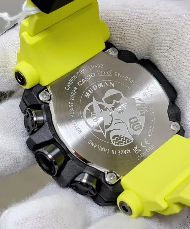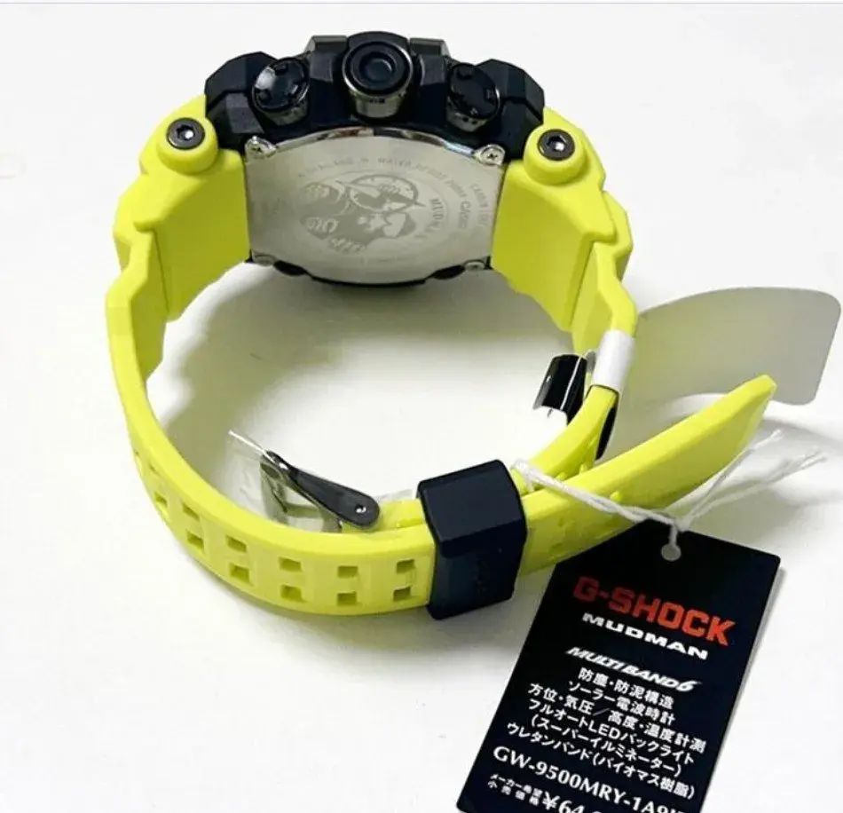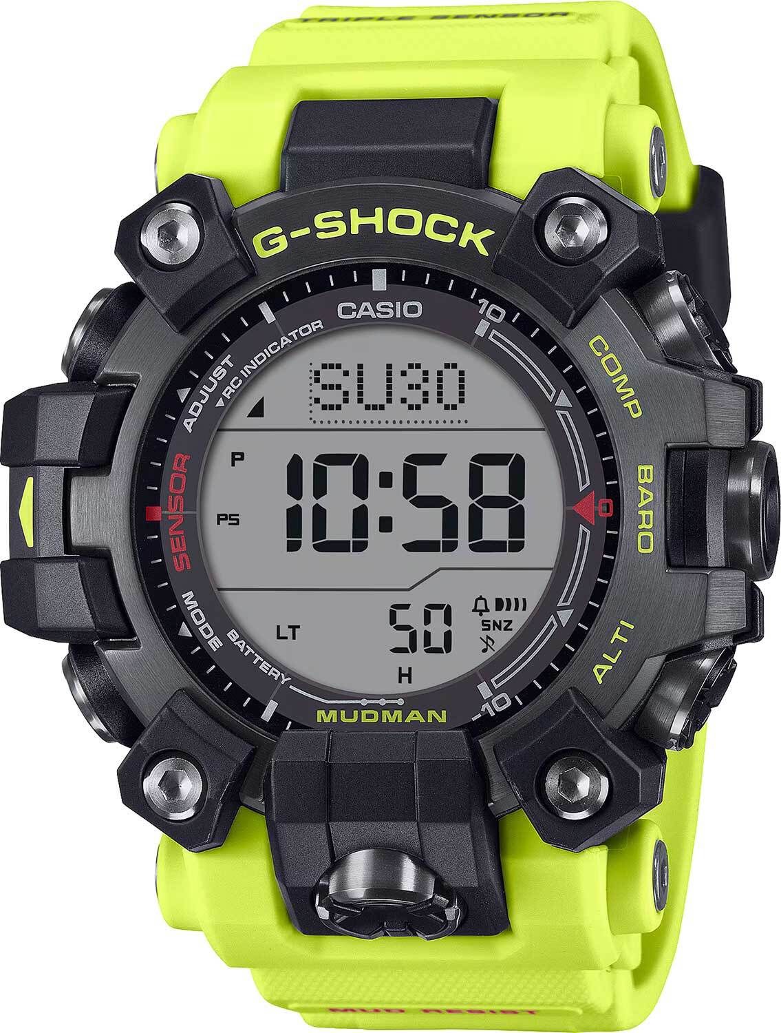Мужские кварцевые электронные часы на солнечной батарее. Серия Casio G-Shock Master Of G Mudman. Противоударный пластиковый корпус с карбоновыми волокнами (структура Carbon Core Guard) более прочный и, в то же время, более легкий, защищает механизм часов от ударов и вибрации. Особая конструкция, устойчивая к пыли и загрязнениям, предохраняет от попадание грязи в часы. Автоматическая светодиодная подсветка - поворот руки при недостаточном освещении обеспечит автоматическое включение подсветки дисплея. Настраиваемое послесвечение 1,5 или 3с, цвет подсветки белый. Питание от солнечной энергии (технология Tough Solar) - источником питания служит светочувствительная панель и аккумулятор, заряжаемый при попадании солнечного света на циферблат часов. Время работы аккумулятора без подзарядки до 6 месяцев, при включенной функции сохранения энергии до 26 месяцев. Функция автоматического сохранения энергии. Индикатор уровня заряда батарейки. Технология Multi Band 6 позволяет принимать сигналы от шести радиовышек, расположенных в различных точках земного шара, которые передают временные сигналы из определенных атомных часов. Коррекция текущего времени радиосигналом почти по всему миру: Англия, Германия, США, Япония и Китай. Технология Triple Sensor позволяет точно и легко определять сторону света, температуру и атмосферное давление. Барометр - специальный датчик измеряет давление воздуха и отображает измеренное значение на экране в виде символа (от 260 до 1100 гПа; 195 до 825 мм рт. ст.). Термометр- датчик измеряет температуру окружающего воздуха вокруг часов и отображает ее на экране в градусах °C (от-10° до +60°С с точностью 0,1°C). Цифровой компас - диапазон измерения от 0° до 359° с точностью 1°,коррекция магнитного склонения, графический указатель направления. Двухслойный ЖК-дисплей позволяет одновременно отображать компас на верхнем слое, время или различные измерения на нижнем слое. Высотомер - встроенный датчик барометрического давления с возможностью вывода результатов в единицах высоты над уровнем моря (от -700 до 10000 метров). Память данных высотомера до 30 записей. График набора высоты. Данные о восходе/закате солнца. Функция мирового времени - 48 городов (31 часовой пояс), всемирное координированное время (UTC), включение/отключение летнего времени. Секундомер с точностью показаний 1/10 секунды и временем измерения 1000 часов. Режимы измерения: прошедшее время, промежуточное время. Таймер обратного отсчета времени от 1мин до 24 ч. 12/24х часовой формат отображения времени. Автоматический календарь до 2099г. 5 ежедневных будильников, один с функцией повтора сигнала Snooze, ежечасный сигнал. Функция отключения/включения звука кнопок. Часы устойчивы к низким температурам (-10 °C). Круглый чёрный корпус из биопластика (изготавливается из возобновляемых органических ресурсов), усиленного углеродными волокнами. Размер корпуса 56,7 мм на 52,7 мм, толщина 14,8 мм. Устойчивое к мелким механическим повреждениям минеральное стекло. На задней крышке выгравирован легендарный крот MUDMAN, держащий компас. Ярко-желтый ремешок вдохновлен аварийно-спасательными службами и знаками безопасности выполнен из биопластика (изготавливается из возобновляемых органических ресурсов), классическая застёжка buckle. Водонепроницаемость WR200 (плавание и ныряние без акваланга). Вес примерно 88 г.