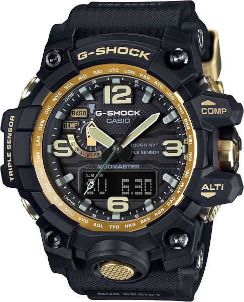 Мужские кварцевые аналого-цифровые наручные часы на солнечной батарее. Серия G-Shock Master Of G Mudmaster. Ударопрочная конструкция защищает механизм часов от ударов и вибрации. Модуль часов снабжен элементами из материала alphaGEL, который еще лучше защищает часы от сотрясения и вибрации (alphaGEL представляет собой гибкую силиконовую прослойку, оказывающую амортизирующий эффект). Часы обладают грязеустойчивостью - особая конструкция предохраняет от попадание грязи и пыли внутрь часов. Устойчивость к воздействию магнитного поля - защитный модуль сохраняет электронику и исключает любые помехи в работе часов. Двойная автоматическая светодиодная подсветка - поворот руки при недостаточном освещении обеспечит включение подсветки циферблат и ЖК-дисплея. Светонакопительное покрытие стрелок обеспечивает длительное послесвечение в темноте после кратковременного воздействия света. Питание от солнечной энергии (технология Tough Solar) - источником питания служит светочувствительная панель и аккумулятор, заряжаемый при попадании солнечного света на циферблат часов. Прием радиосигнала (Европа, США, Япония, Китай) для корректировки точности времени (Технология Multi Band 6). Система Smart Access с помощью переводной головки обеспечивает простой и удобный доступ ко всем важным функциям часов - нажатие или поворот переводной головки позволяет переключаться между различными режимами и активировать будильник, таймер, секундомер, а также настраивать функцию мирового времени. Секундомер с точностью показаний 1/100 с и временем измерения 24 часа. Режимы измерения: прошедшее время, промежуточное время, два финишных результата. Таймер обратного отсчёта от 1 минуты до 60 минут с автоповтором. Технология Triple Sensor позволяет точно и легко определять сторону света, температуру и атмосферное давление. Барометр - специальный датчик измеряет давление воздуха от 260 до 1100 гПа (от 195 до 825 мм рт. ст.) и отображает измеренное значение на экране в виде символа. Термометр - датчик измеряет температуру окружающего воздуха вокруг часов и отображает ее на экране в градусах °C (-10°C /+60°C). Цифровой компас - диапазон измерения от 0° до 359° с точностью 1°. Двунаправленная калибровка и коррекция магнитного склонения. Высотомер (альтиметр) - встроенный датчик давления определяет изменения в атмосферном давлении и преобразовывает полученные результаты в абсолютную высоту до 10 000 м. График набора высоты. Память данных высотомера —в записной книжке хранятся данные о результатах измерений, выполненных в режиме высотомера. Отображение времени восхода и захода солнца для определенной даты. Индикатор местоположения указывает направление и расстояние до ранее сохраненного местоположения. Функция мирового времени - 38 часовых поясов (55 городов), всемирное координированное время (UTC), автоматический переход на зимнее и летнее время (DST), возможность включения/отключения данной функции, переключение местного на мировое время. 5 ежедневных будильников, сигнал начала часа. Функция автоматической настройки положения стрелок проверяет исходное положение стрелок каждый час и корректирует его в случае необходимости (изменение после удара, либо из-за влияния магнитного поля). Включение/выключение звука кнопок. Функция перемещения стрелок для удобного просмотра информации на цифровом экране. Функция поиска т